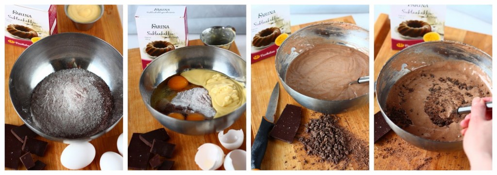 Kaada kulhoon 1 pussi Farina suklaakakkujauhoseosta. Riko kulhoon myös munat ja mittaa juokseva rasva. Vatkaa sähkövatkaimella n. 1 minuutti, kunnes seos on kuohkeaa. Rouhi suklaa hienoksi rouheeksi. Sekoita se suklaataikinan joukkoon.