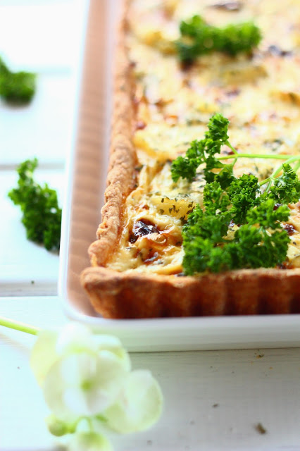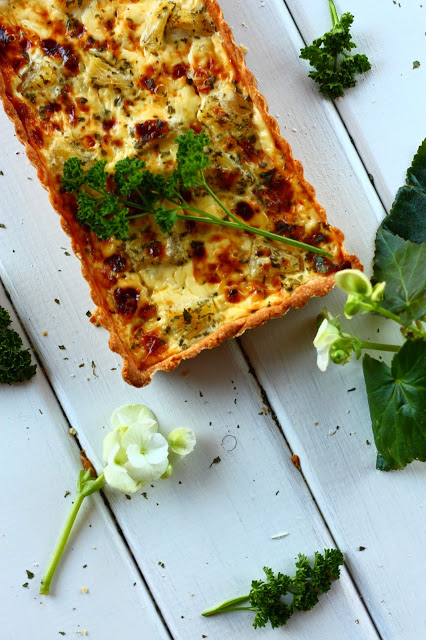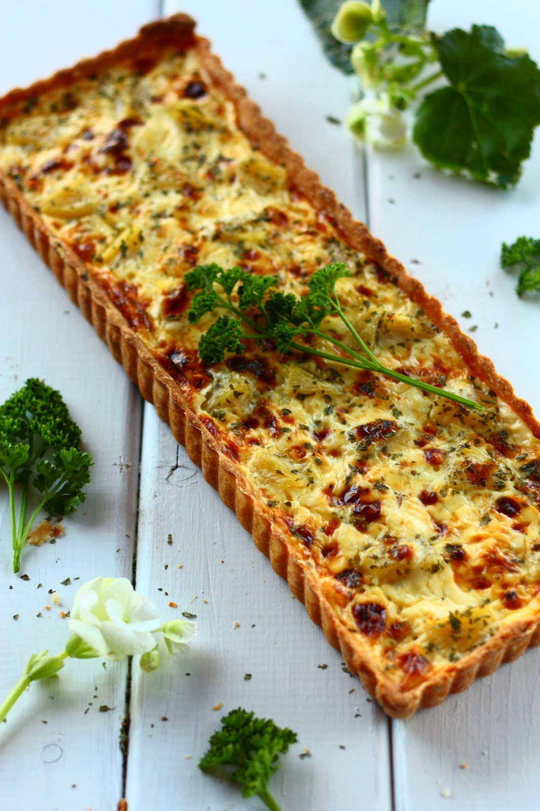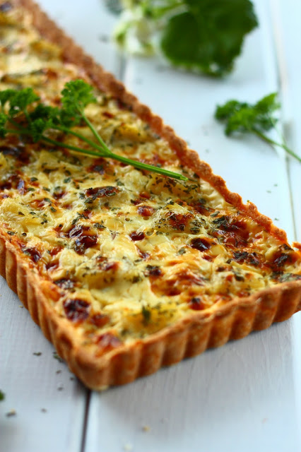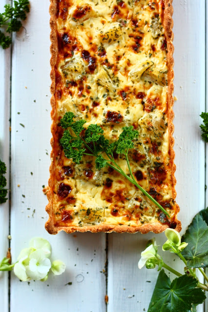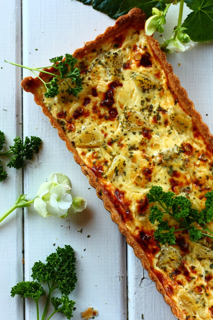 Tein ananasta ja aurajuustoa sisältävän kinkkupiirakan suorakaiteen muotoiseen vuokaan. Tonnikalaversio päätyi pyöreään vuokaan.