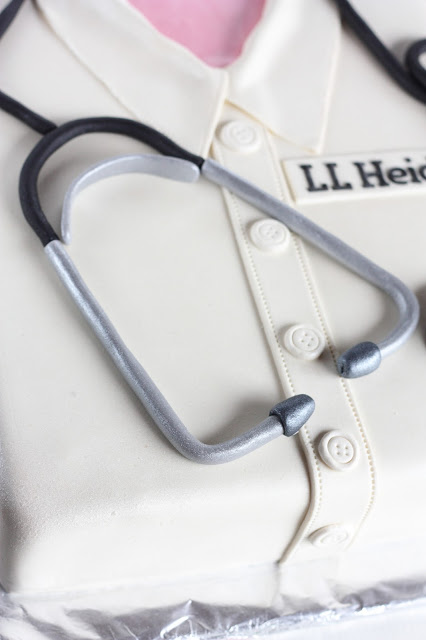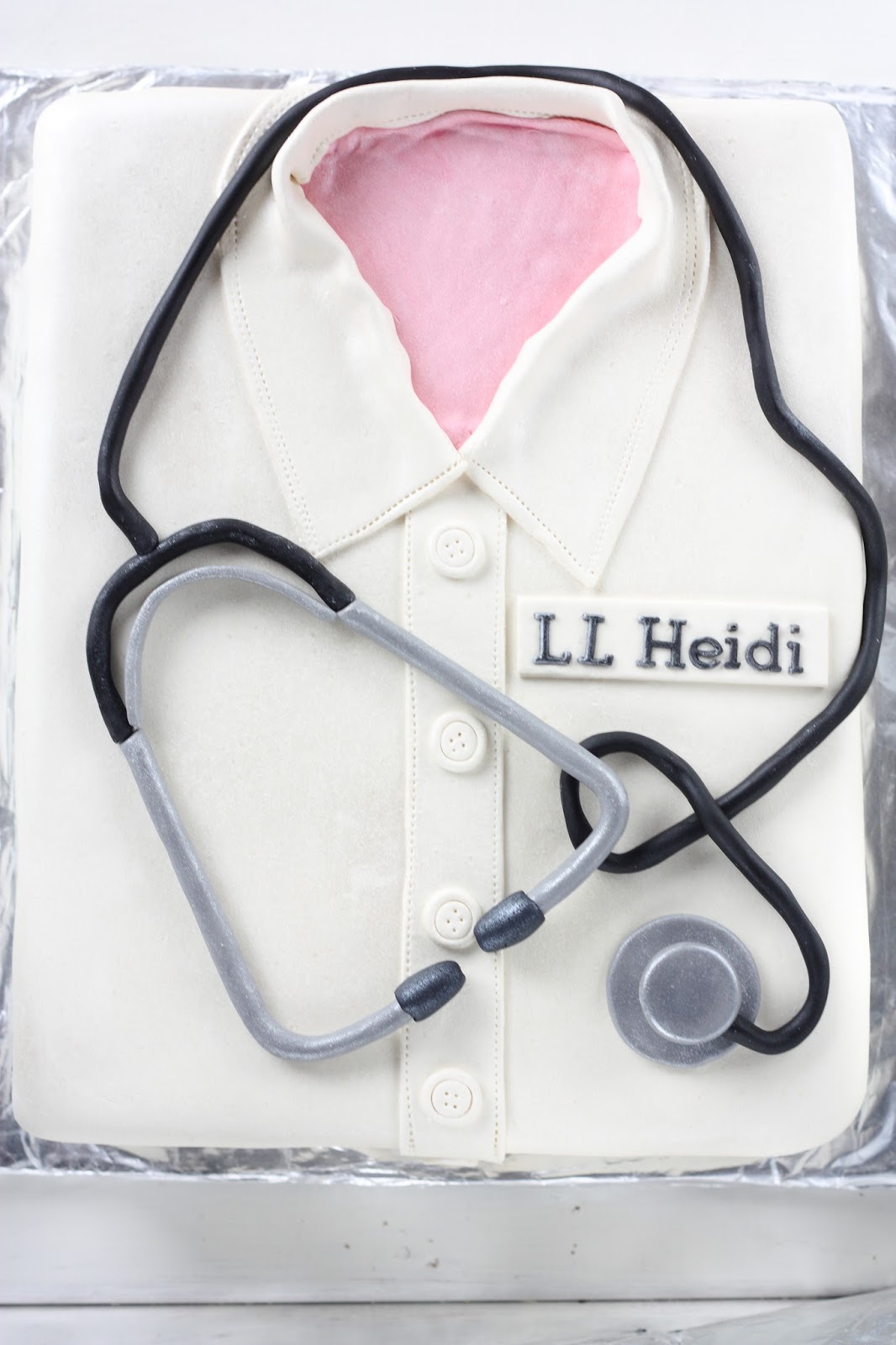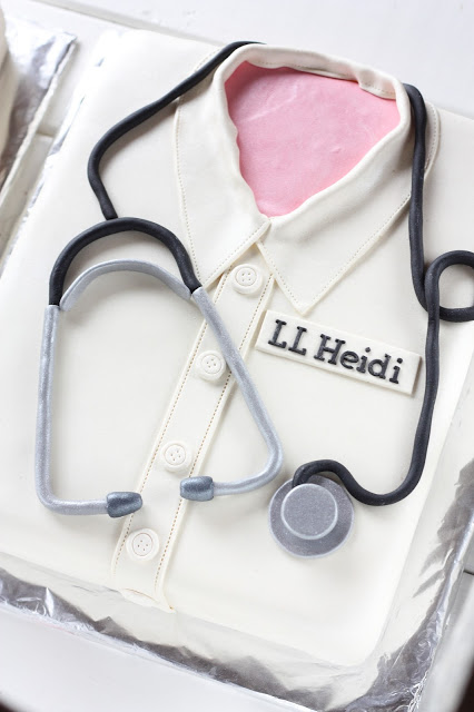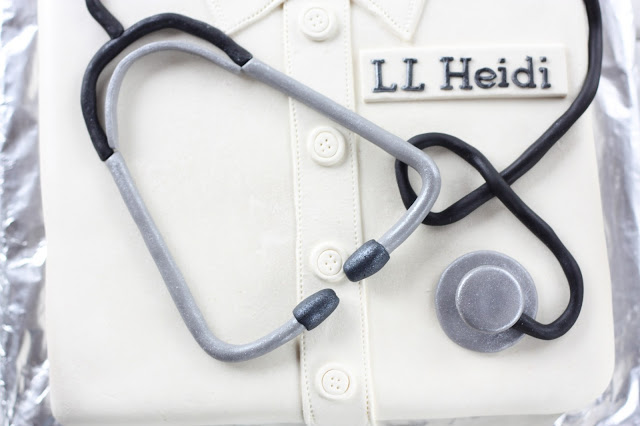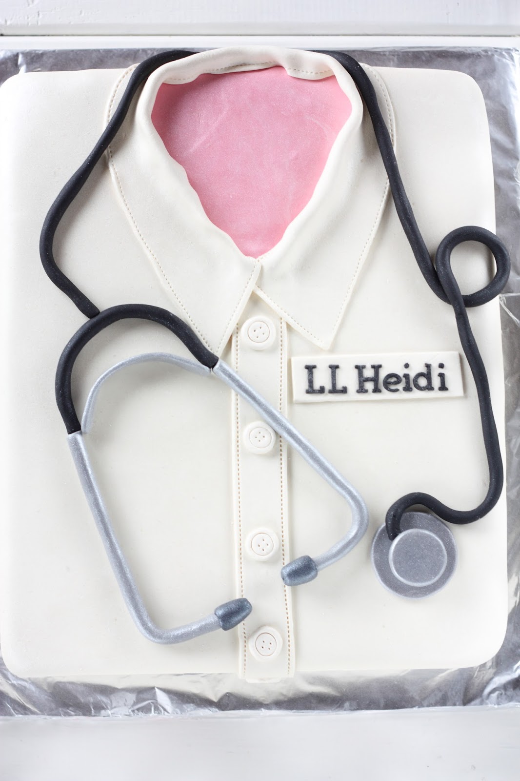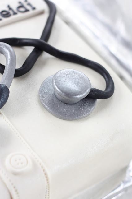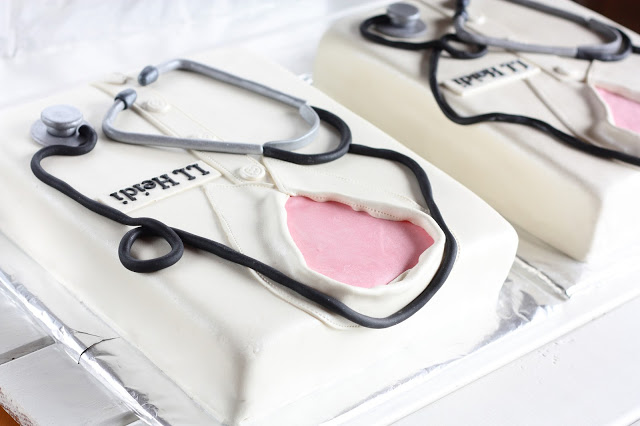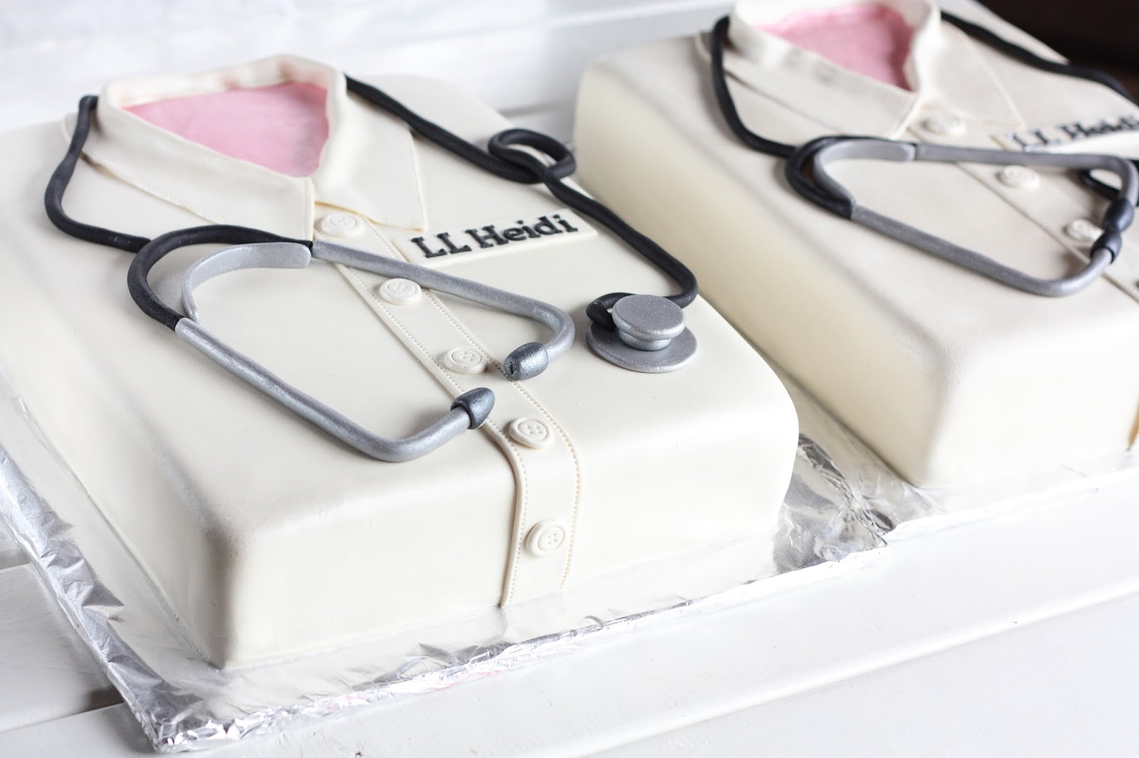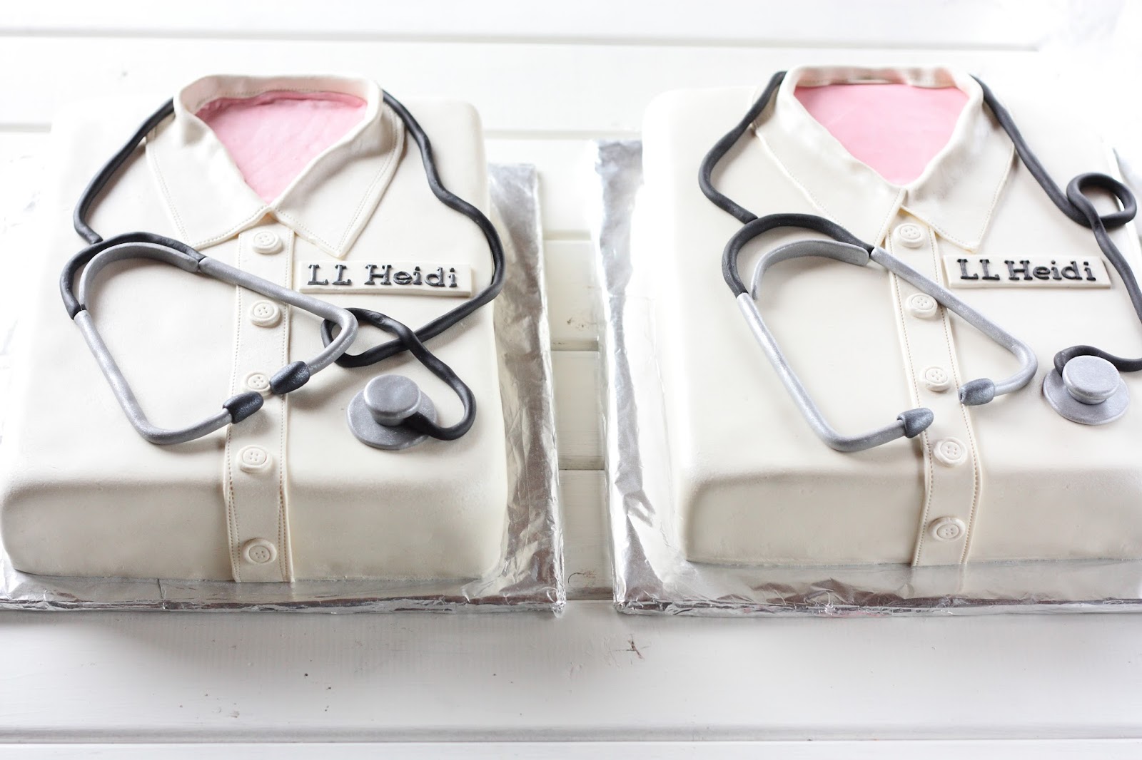 Viime viikonloppuna vietettiin monessa kodissa valmistujaisia. Sain kunnian tehdä valmistuneelle lääkärille valmistujaiskakut. Kakkujen päälle toivottiin jotain lääkäriin liittyviä juttuja, ja lopulta päädyimme kahteen lääkärintakkia muistuttavaan suorakaiteen muotoiseen kakkuun, joiden päältä löytyisi stetoskooppi ja nimikyltti. Tällaiset niistä tuli.