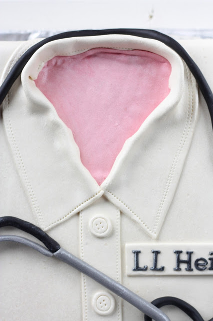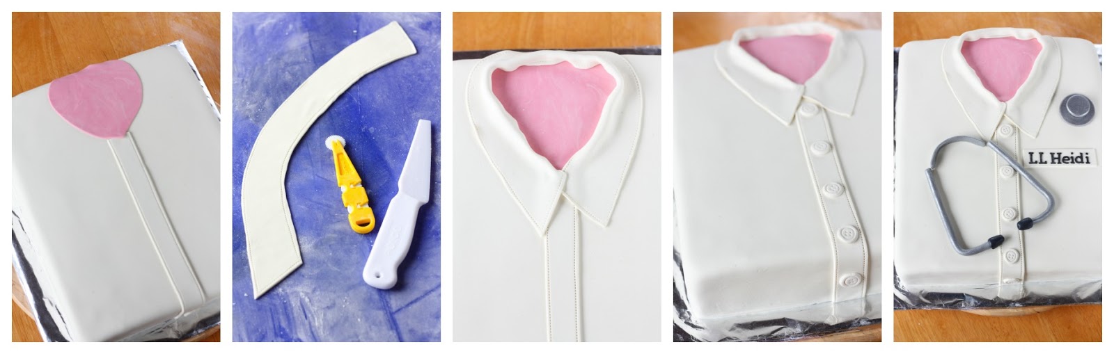 Tee kauluksen alle värillinen kolmio. Leikkaa valkosuklaamassasta kaulus ja muotoile se paikalleen. (Katselin kauluksen tekemiseen esimerkkiä kaapissa olleesta kauluspaidasta, ja siinä taisi kaulus olla hippasen ryppynen, kun lopputuloksesta tuli tuollainen röpelöinen). Viimeistele stetoskoopeilla ja nimikyltillä.