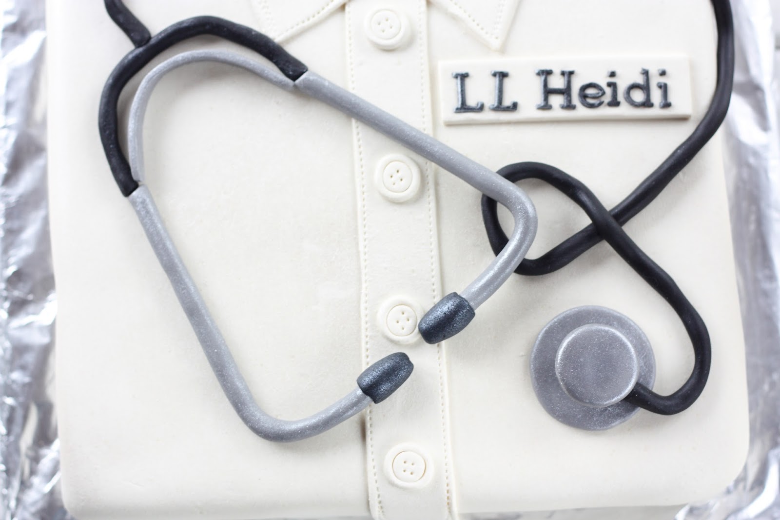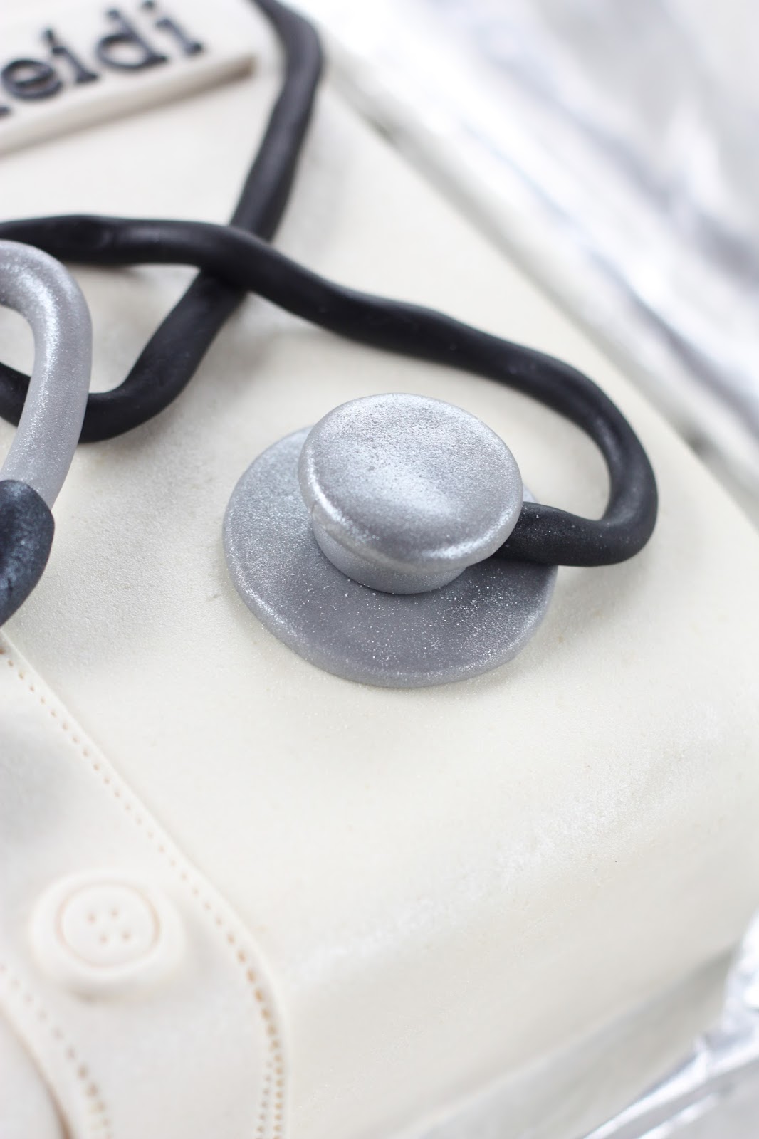 Koristeet: – stetoskoopin harmaat osat sokerimassan ja kaulintamassan sekoitusta, värjätty mustalla pastavärillä, päällä ohut kerros hopeisen metallin väristä kimalleväriä – stetoskoopin mustat osat mustaa sokerimassaa – nimikyltti valkosuklaamassaa, päällä mustasta sokerimassasta muotilla tehdyt kirjaimet