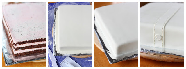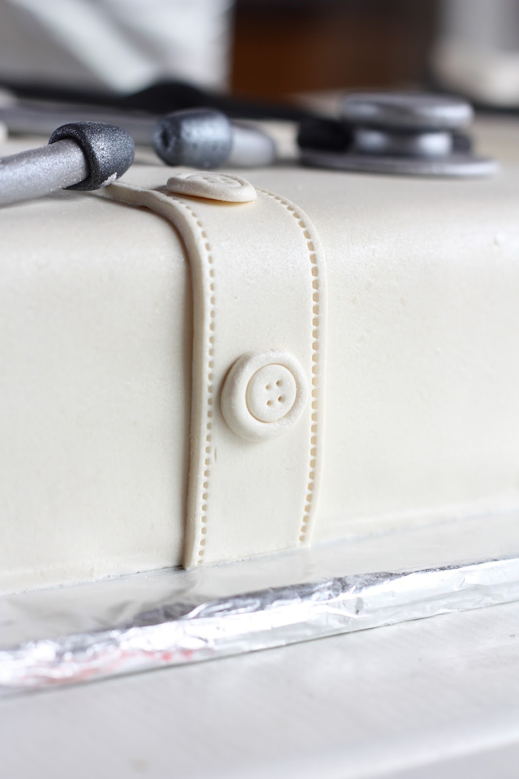 Kuorruta kakku valkosuklaamassalla. Kaulitse valkosuklaamassa ohuehkoksi, kakkua isommaksi levyksi. Nosta kakun päälle ja painele reunoille. Leikkaa ylimääräiset pois, mutta jätä parisen senttiä alareunaan jäljelle. Tasoita päällinen ja silitä reunat kunnolla. Siisti reunat vielä kunnolla. Kaulitse lopputaikinasta ”nappilista” ja kiinnitä se vesitilkalla. Muotoile napit.