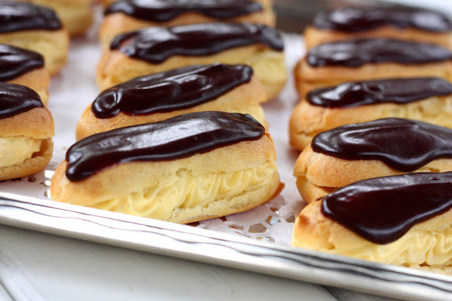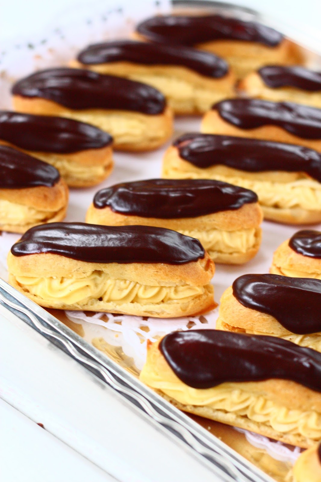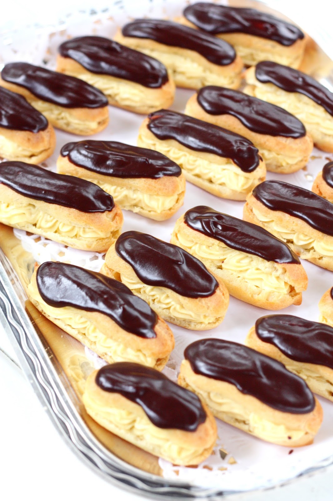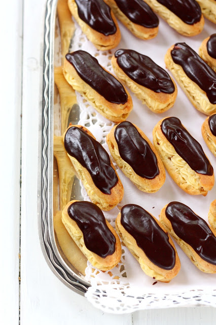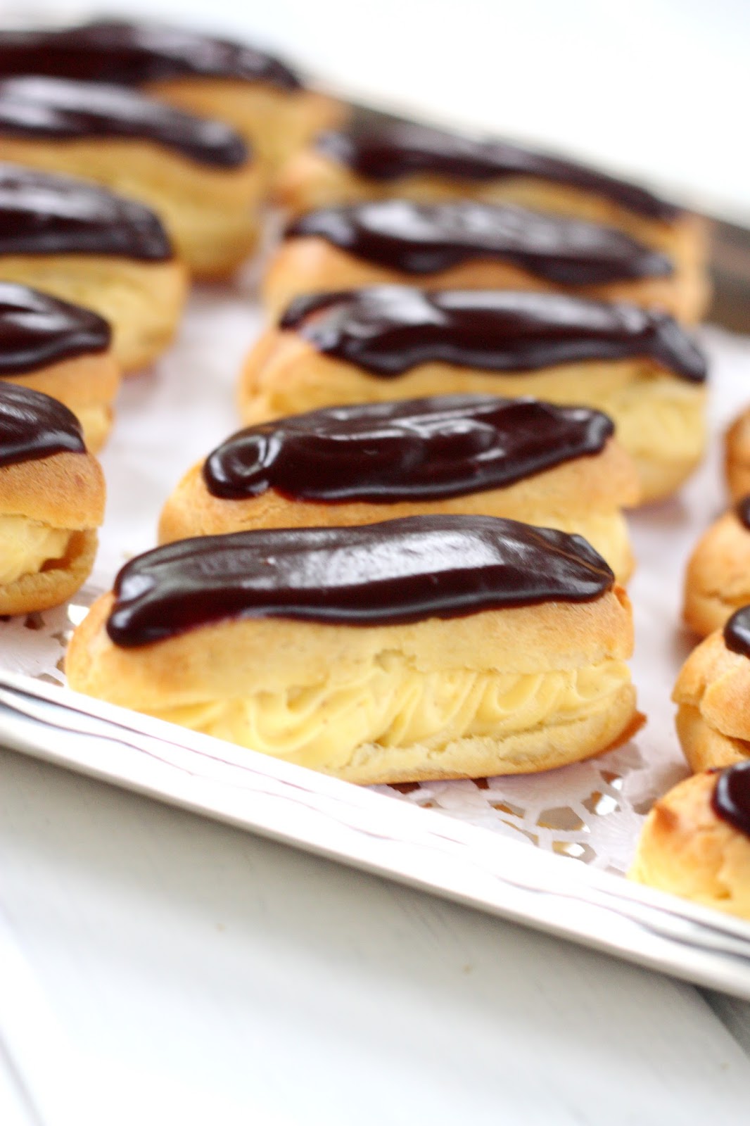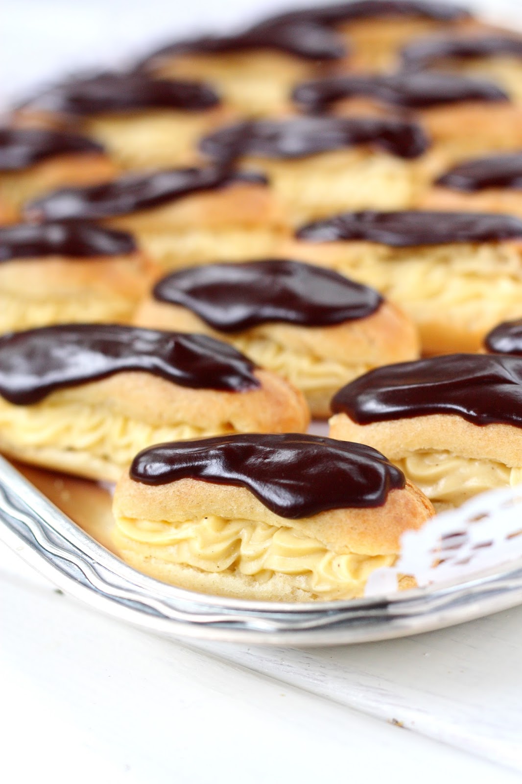 Éclair on ranskasta kotoisin oleva suklaakuorrutteinen tuulihattu, jossa on täytteenä pehmeää vaniljakiisseliä. Niiden tekeminen on ollut listallani jo jonkun aikaa ja teinkin niitä nyt tytön synttäreille. Ja hyvä, että kokeilin. Nämähän olivat hyviä! Täyte oli ihanan pehmoinen, kunnon vaniljainen. Päällä oleva ohut suklaakerros toi juuri sen verran suklaisuutta, että kokonaisuus pysyi hillityn makeana ja yhden jälkeen ei tehnyt lainkaan pahaa ottaa toista makupalaa 🙂