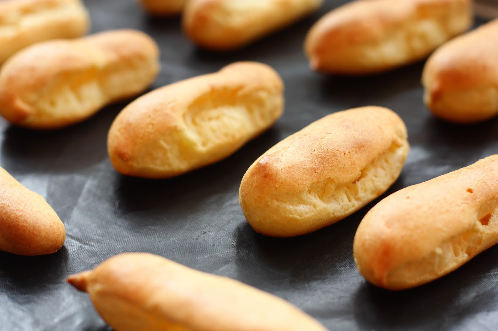 Ohje: Laita uuni lämpeämään 200 asteeseen. Kuumenna rasva, maito, vesi, sokeri ja suola kattilassa kiehumispisteeseen. Lisää jauhot sekoittaen taikinaan puuhaarukalla. Keitä seosta koko ajan sekoittaen, kunnes siitä muodostuu möykky ja se irtoaa kattilan reunoista. Taikina on tässä vaiheessa sitkeää. Nosta kattila pois liedeltä ja anna taikinan jäähtyä kunnolla. Laita kattila vaikkapa kylmää vettä sisältävään altaaseen nopeuttaaksesi jäähtymistä. Lisää jäähtyneeseen taikinaan munat yksitellen sähkövatkaimella voimakkaasti vatkaten. Lisää seuraava muna vasta, kun edellinen on sekoittunut taikinaan kunnolla! (Lisää leivinjauhe yhdessä viimeisen munan kanssa).