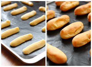 No taikinan tekemisen kehumisen jälkeen tunnustan pienoisen mokan. Ei nimittäin kaikki sujunut aivan suunnittelmien mukaan. Unohdin nimittäin leivinjauheen ensimmäisen pellillisen tuulihattupötköistä. Huomasin erheeni vasta kun olin saanut taikinapötköt pursotettua pellille. Eipä muuta kuin lopputaikina äkkiä takaisin kulhoon, leivinjauheen ripottelu pinnalle ja vatkaimella kunnolla sekaisin. Toinen pellillinen tuulihattuja paistui siis leivinjauheella, ja toinen ilman. Mutta eipä eroa kuitenkaan oikein huomannutkaan! Molemmat taikinat nousivat, pullistuivat ja tulivat lopulta ontoiksi. Eli tämän perusteella leivinjauheen lisääminen ei olisikaan pakollista, vaan nouseminen tapahtuu munien (ja vesihöyryn voimalla). Aivan kuin sokerikakkupohja. Sekään ei tarvitse leivinjauhetta, kunhan munat ja sokeri on vatkattu kunnolla ja nouseminen tapahtuu muniin kertyneiden ilmankuplien voimin.