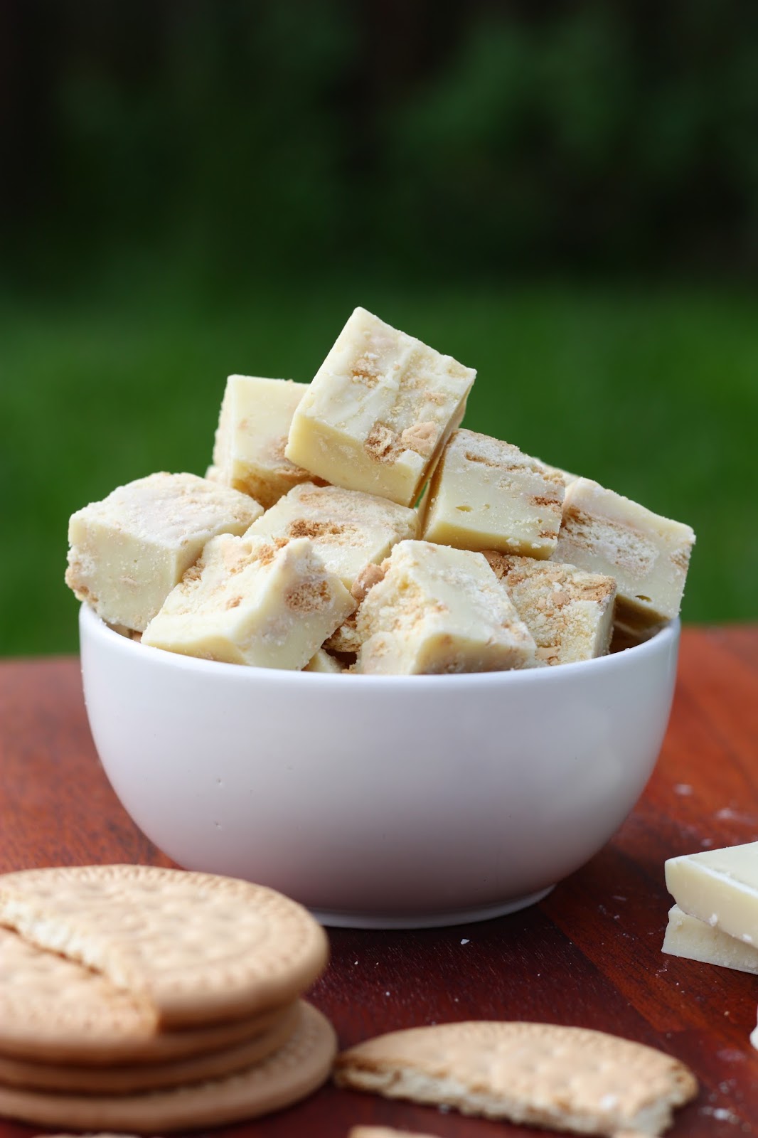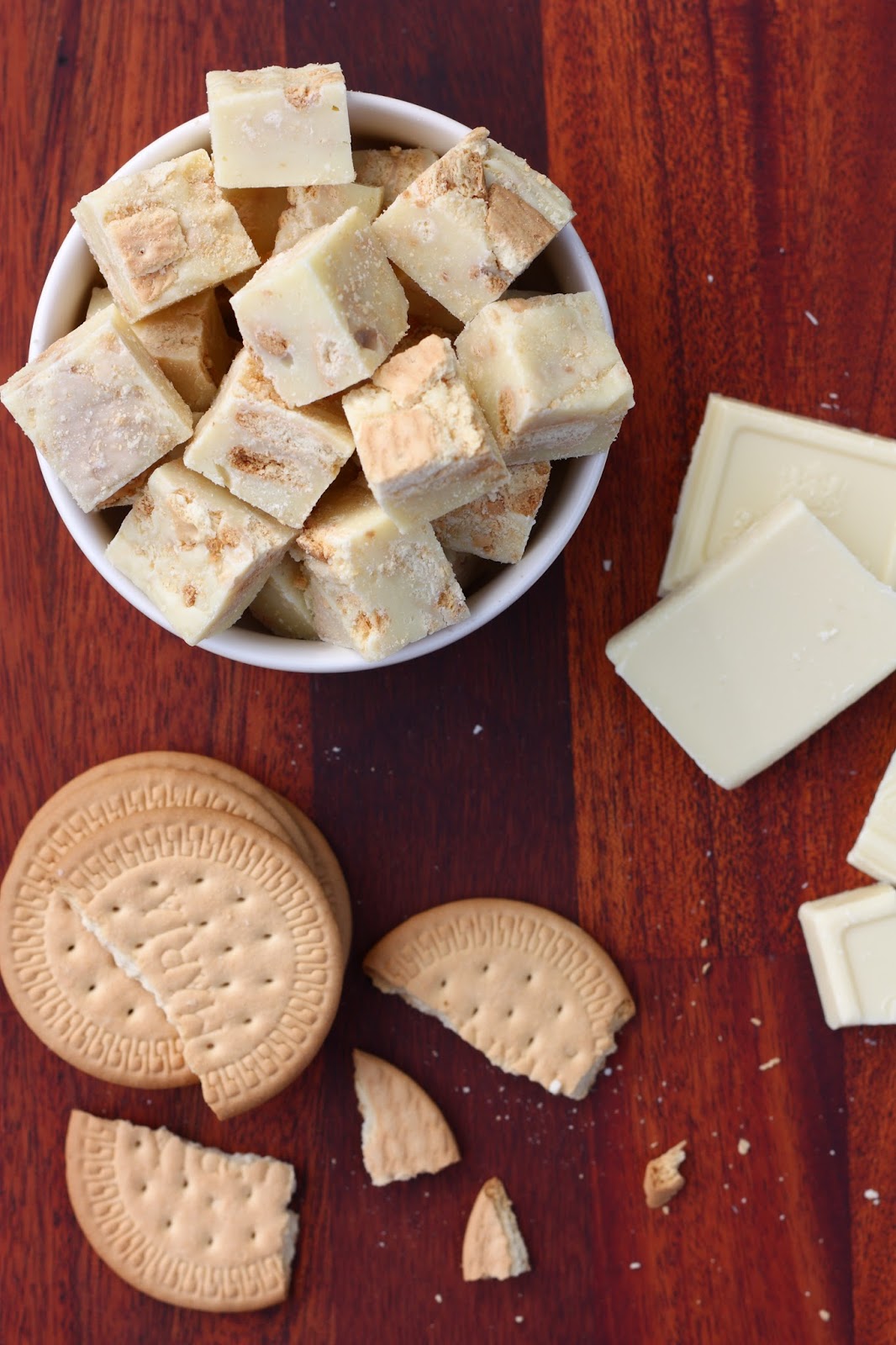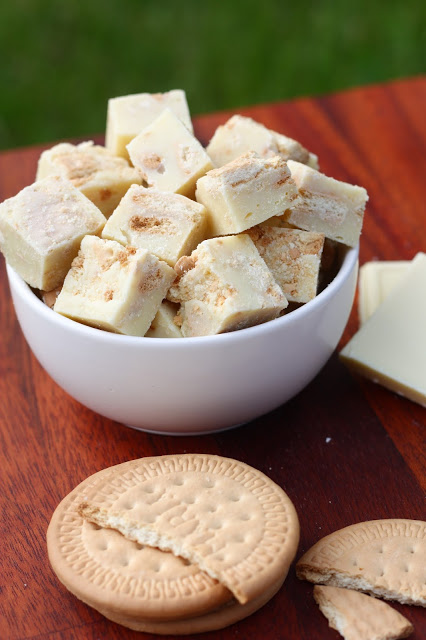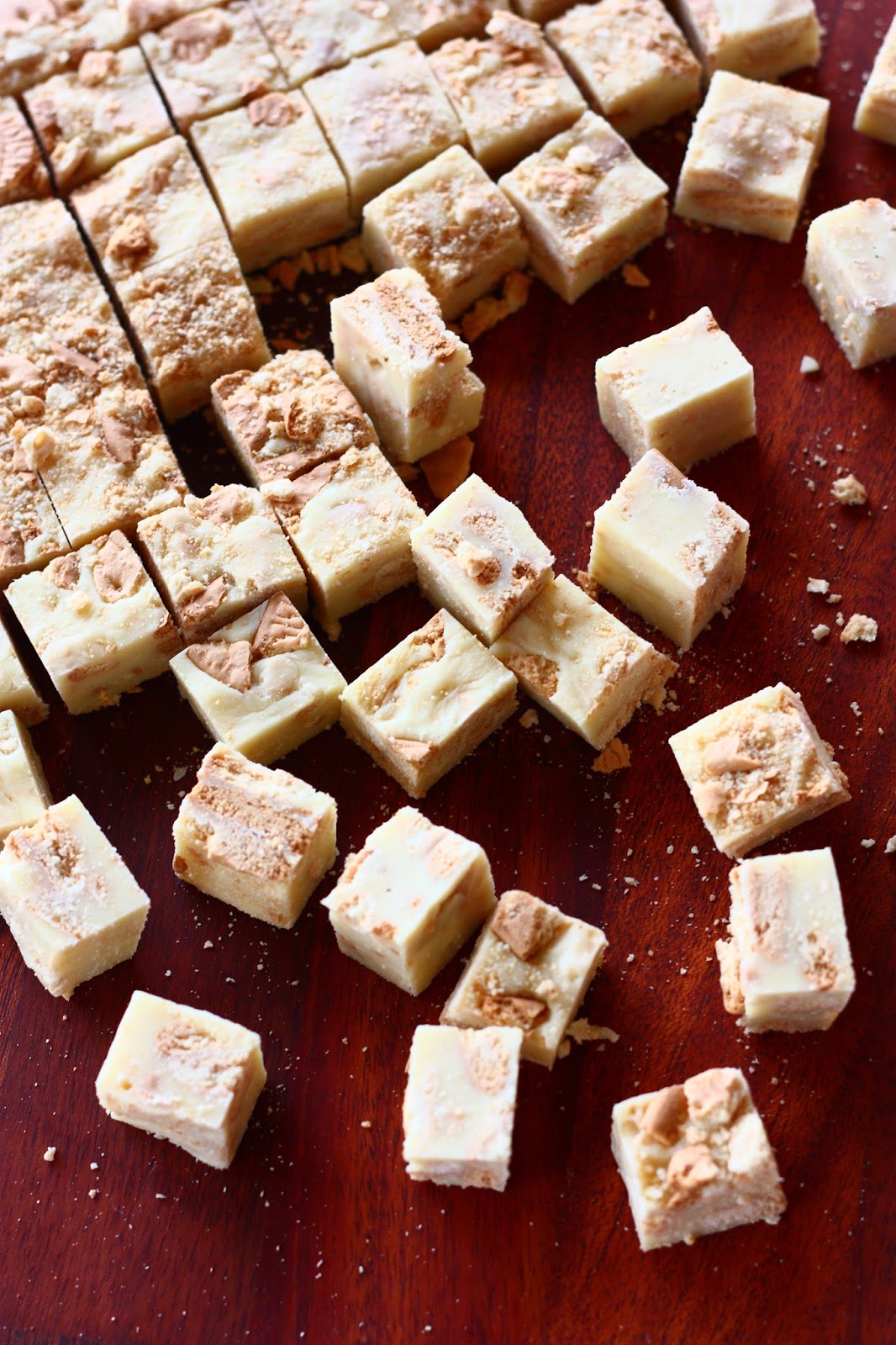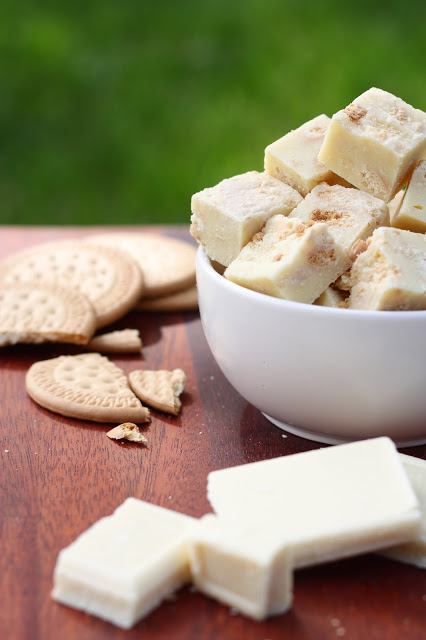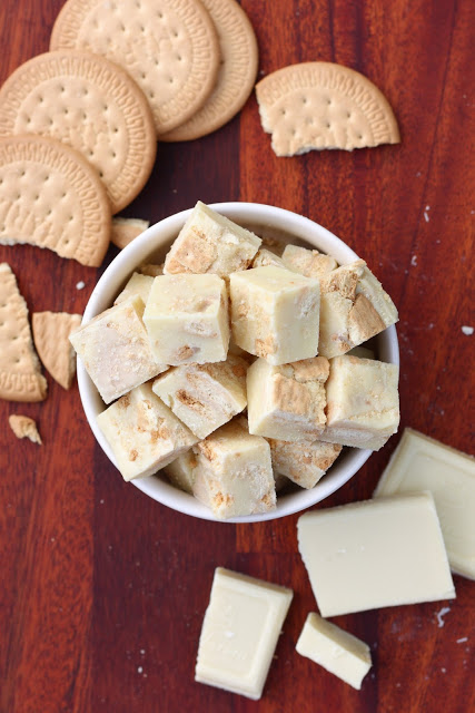 Pelkäsin vähän etukäteen, että keksit muhjaantuvat fudgemassan sisällä ja lopputulos muistuttaa enemmänkin fudgea, jossa uiskentelee märkiä keksin paloja. Kävinkin malttamattomana fudgelevyn kimppuun, kun se oli juuri ja juuri jähmettynyt. Leikkasin reunasta palasen, ja voi että, keksit olivat ihania rapeita sattumia pehmeän valkosuklaafudgen joukossa! Rapeus säilyi myös seuraavaan päivään. Testailin myös pakastamista, mutta siitä fudget tai pikemminkin keksit eivät pitäneet, vaan kokonaisuudesta tuli juuri sitä mitä ensin pelkäsinkin eli mössöä.