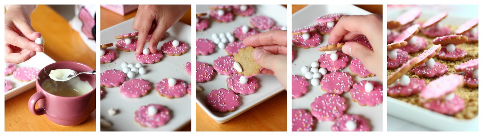 Tarjolla oli popcornien, kalkkunanakki-tomaatti-juusto-viinirypäletikkujen, suolakalojen, hedelmäkarkkien sekä vaahtokarkkien lisäksi myös alempana olevassa kuvassa näkyviä simpukkakeksejä. Keksien helmet ovat Mariannekuulia (jotka löysin pitkän etsinnän jälkeen ja kälyn vinkistä k-kaupasta). Tyttö auttoi simpukoiden tekemisessä ja liimasi kuulat kekseihin sulatetulla valkosuklaalla (alla kuvat 1-2). Keksit ”niittasin” yhteen pienellä palalla valkosuklaamassaa (alla kuvat 3-4). Vuoan pohjalle murskattiin tytön kanssa yhteisvoimin vielä hieman digestive-keksejä hiekaksi (kuva 5).