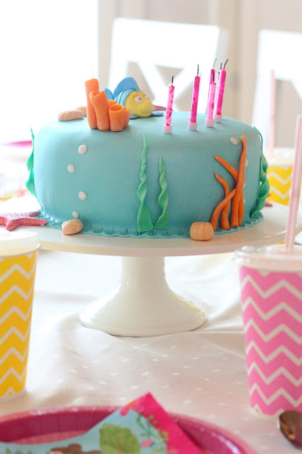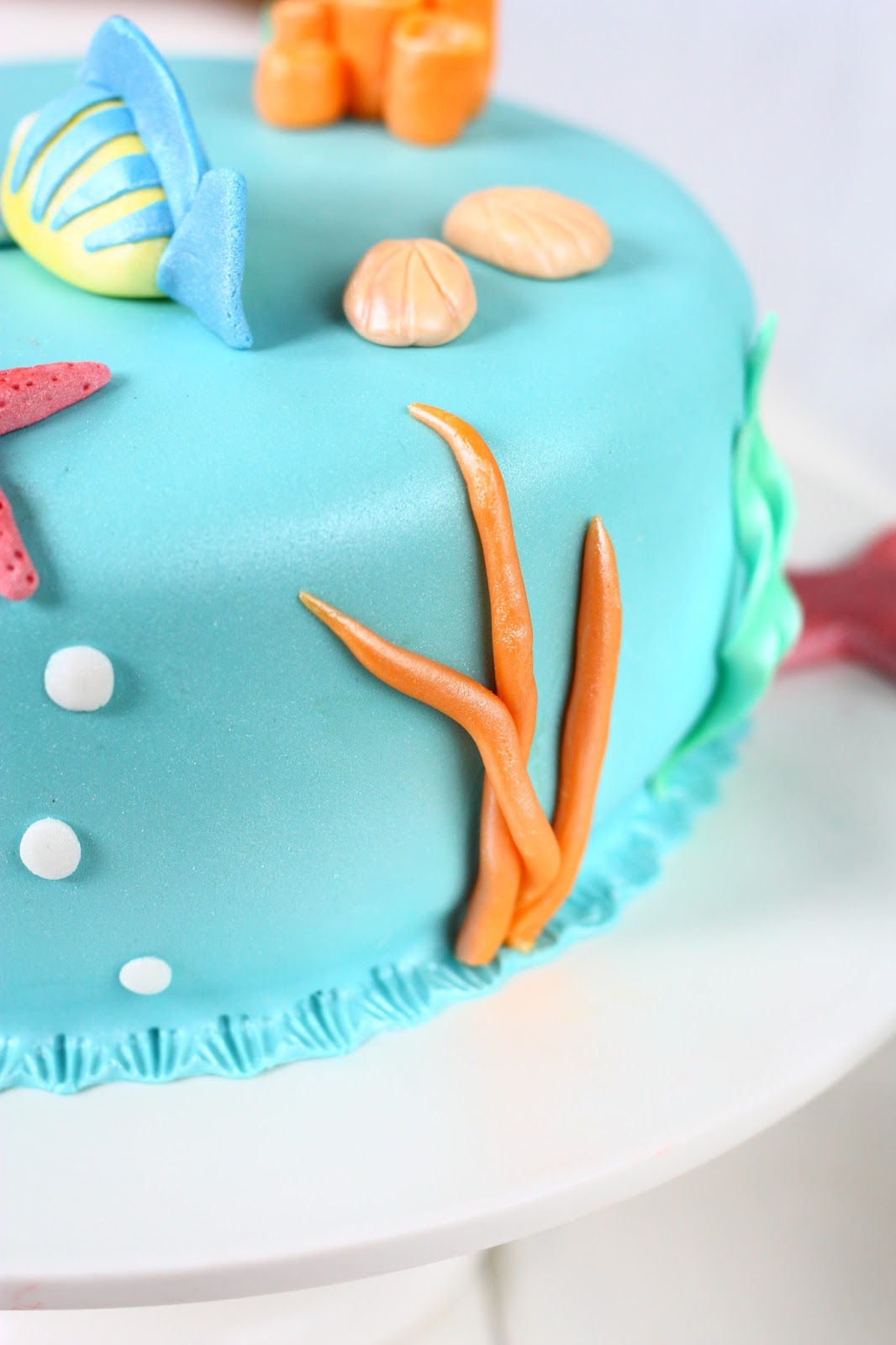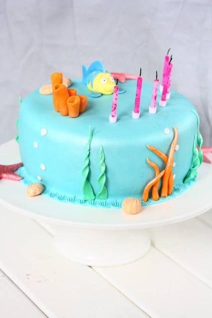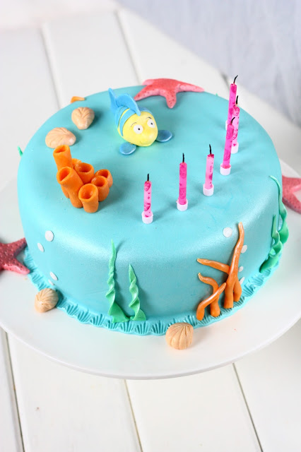 Tytär vietti kaverisynttäreitään kesäkuussa viikko sukulaissynttäreiden jälkeen. Molempien juhlien kakut noudattivat samaa meriaiheista teemaa. Ariel-kakun jälkeen teinkin tällaisen toisen hyvin samankaltaisen kakun, mutta tällä kertaa kakun päällä seikkaili Arielin sijasta vain hänen kaverinsa Nemo Pärsky. Lisäksi muutama simpukka sinne tänne ja vähän meriheinää- ja mitä-lie-meriruohon näköistä kakun reunoille 🙂
