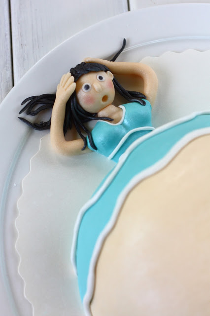 Kokoa kakku loppuu. Muotoile pääosa ja yläkroppa ihonvärisestä ja turkoosista valkosuklaamassasta. Rullaa hiukset paikoilleen. Kaulitse turkoosista valkosuklaamassasta ohut levy ja tee siitä masukakun paita ja housut (eka ja toka kuva alla). Tee kakulle jalat ja napit (kolmas kuva) ja koristele paitaosaa haluamallasi tavalla (neljäs kuva). Itse tein paitaan tuollaisia pitkulaisia raitoja, kun muuten se näytti niin plankkolta.