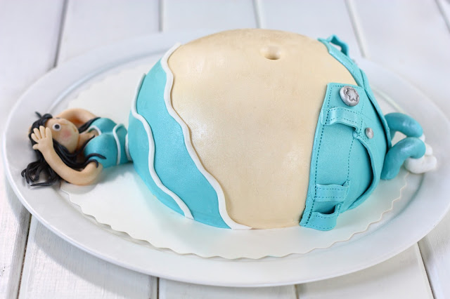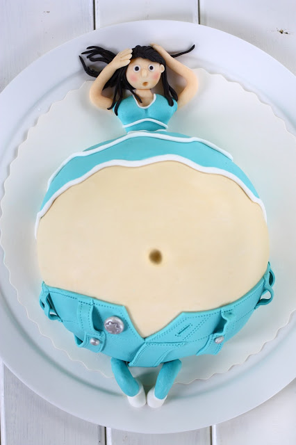 Tuosta täytetystä osasta tulee siis vatsa. Kun kakku on hyytynyt, kippaa se kulhosta tarjoilulautaselle. Sivele pintaan vaahdotettua kermaa tartuntapinnaksi. Kaulitse ihon väriseksi värjätty valkosuklaamassa ohuehkoksi, pitkulaiseksi levyksi. Nosta kakun päälle, tasoita ja paina keskelle kakkua varovasti pyöreäpäisellä työkalulla napa.