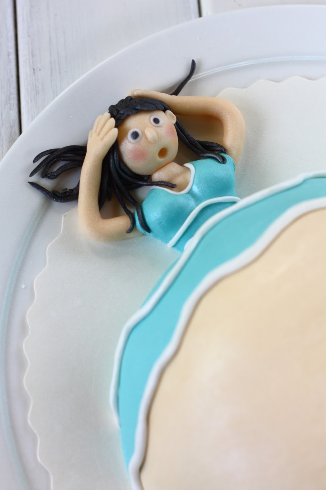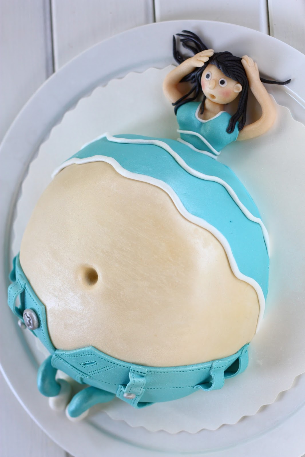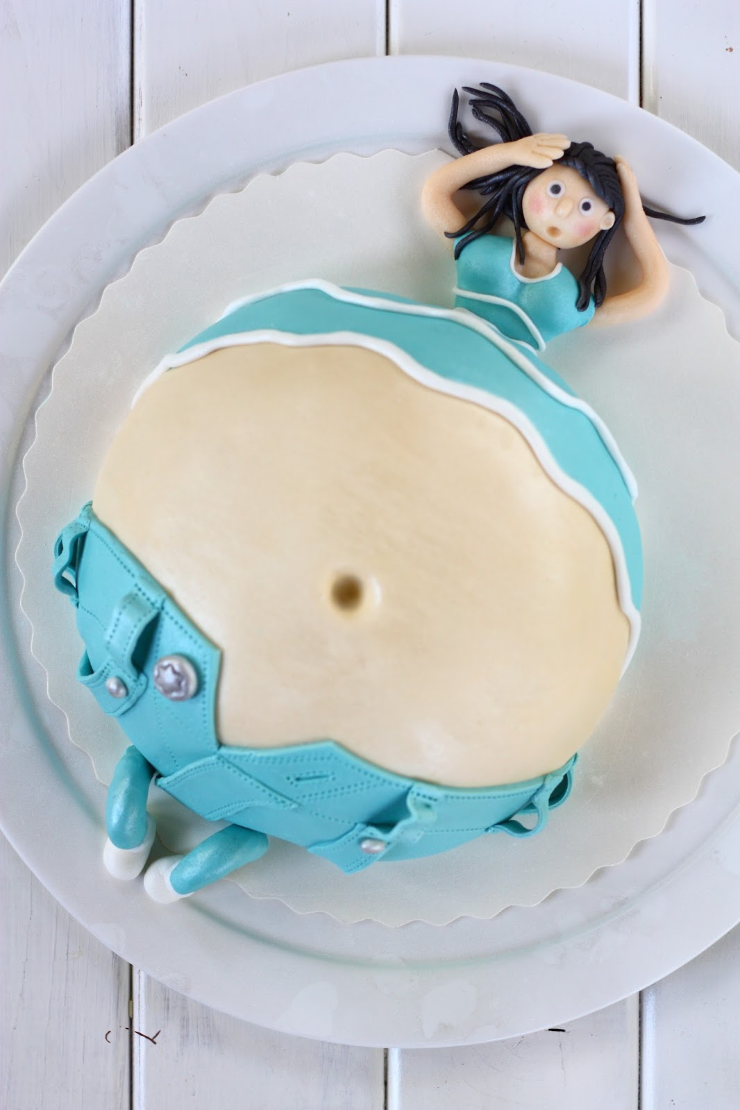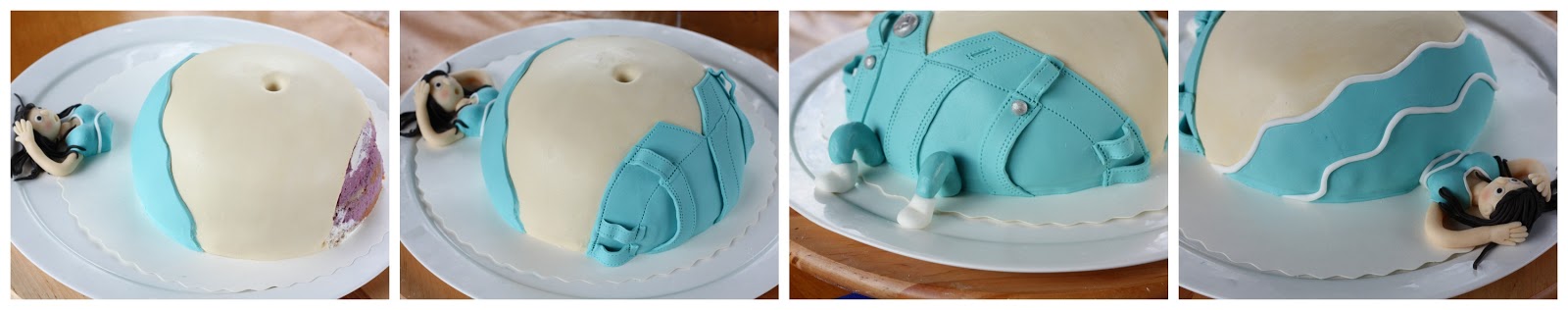 Kokoa kakku loppuu. Muotoile pääosa ja yläkroppa ihonvärisestä ja turkoosista valkosuklaamassasta. Rullaa hiukset paikoilleen. Kaulitse turkoosista valkosuklaamassasta ohut levy ja tee siitä masukakun paita ja housut (eka ja toka kuva alla). Tee kakulle jalat ja napit (kolmas kuva) ja koristele paitaosaa haluamallasi tavalla (neljäs kuva). Itse tein paitaan tuollaisia pitkulaisia raitoja, kun muuten se näytti niin plankkolta.
