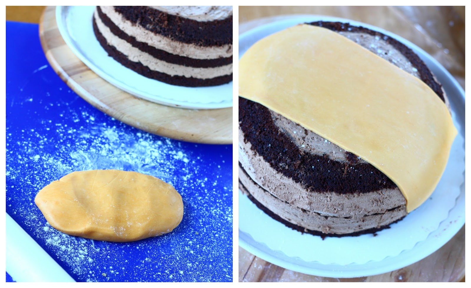 Poista vuoan irtoreunat (siis jos käytit sellaisia). Värjää osa massasta oranssiksi. Kaulitse oranssi valkosuklaamassa ohueksi, suorakaiteen muotoiseksi levyksi. Laita kakun päälle. Leikkaa ylimääräiset reunoilta pois. Tästä osasta tulee se osa, jossa silmät ovat.
