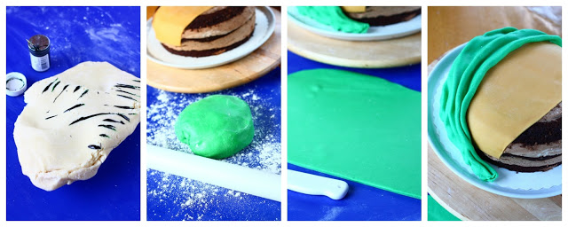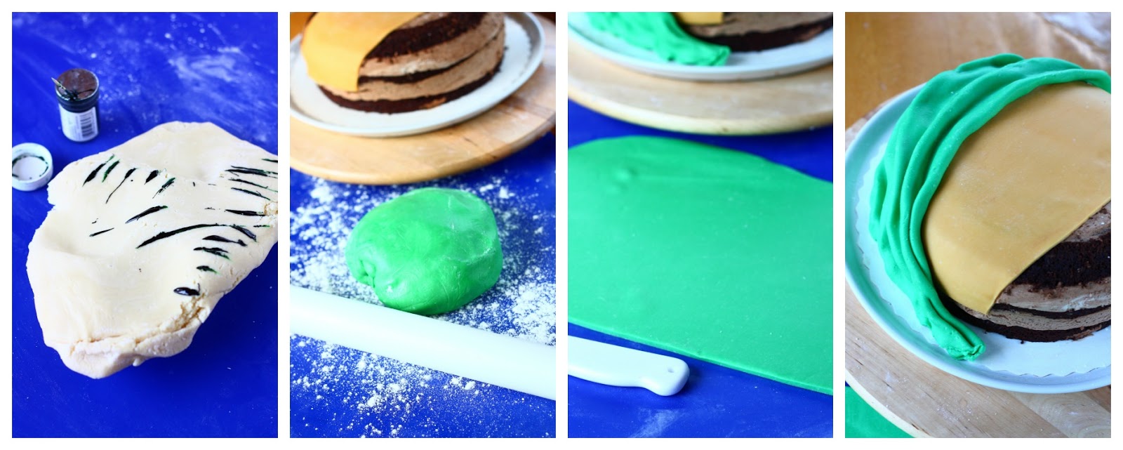 Värjää loppumassa vihreäksi. Osa siitä toinen puoli työnalle. Kaulitse ohuehkoksi levyksi. Nosta levy kakun toiseen reunaan ja rypytä laskoksille. Siisti alareunat. Tee toiselle vihreälle massalle samoin.