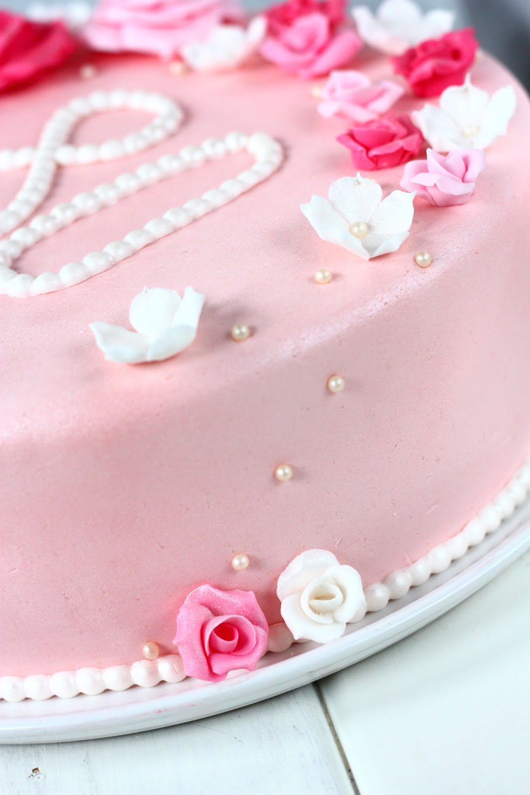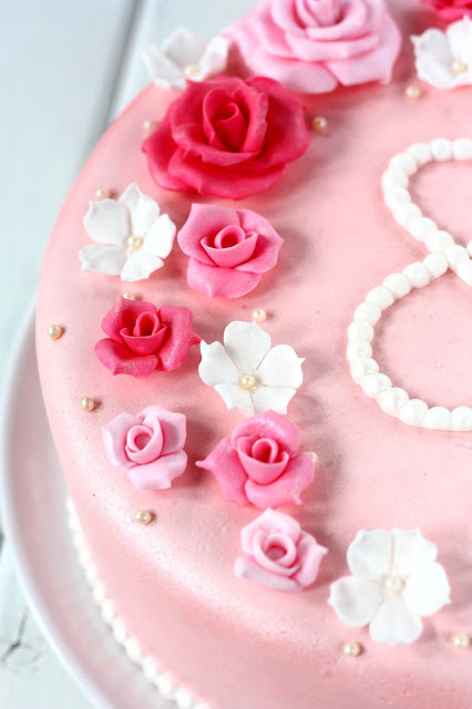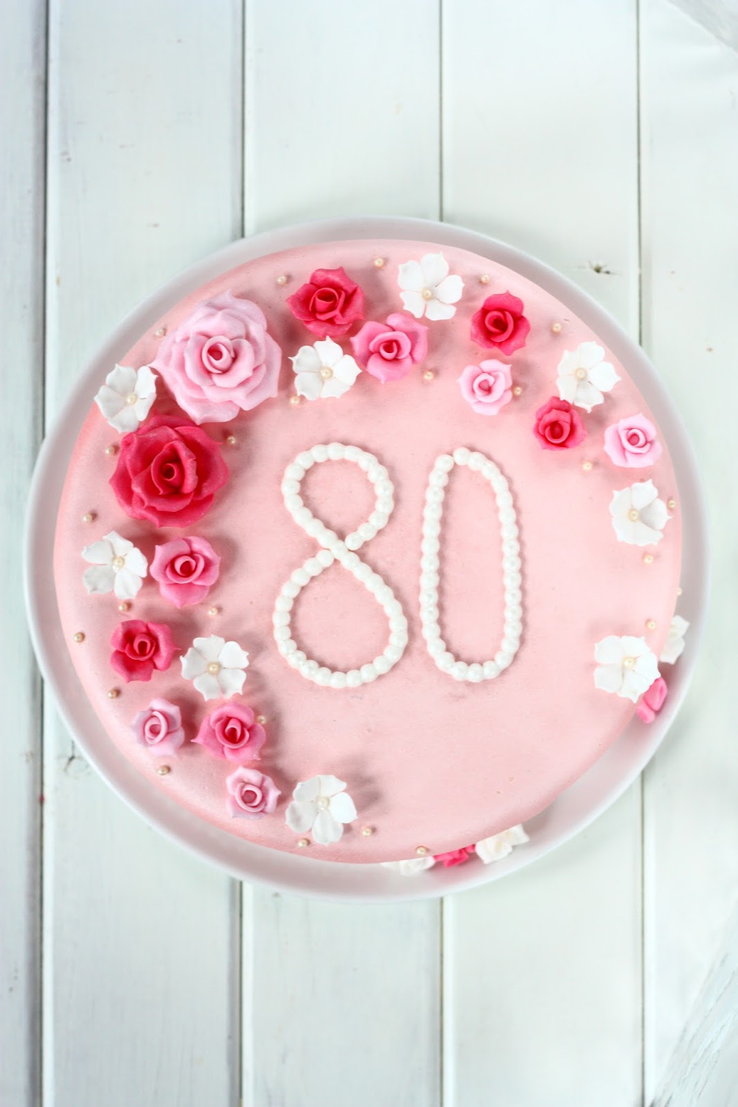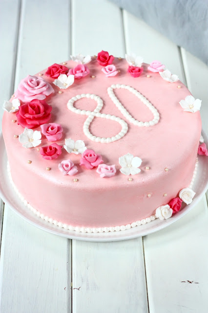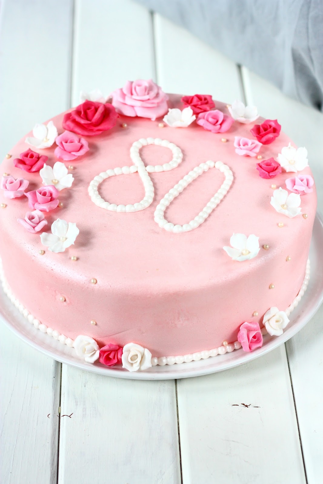 Töissä vietettiin kesäkuun loppupuolella kahden tasavuosia täyttävän naishenkilön yhteisiä kahdeksankymppisiä. Sain kauniin pyynnön tehdä juhlakahville kakun. Toiveena oli suklainen sisältö pinkillä mousseraidalla, paljon eri pinkin värisiä ruusuja, helminauhaa ja hailakan roosan värinen kuorrutus. Sellainen 80-vuotiaan kakku siis 🙂 Ja tällainen siitä tuli.