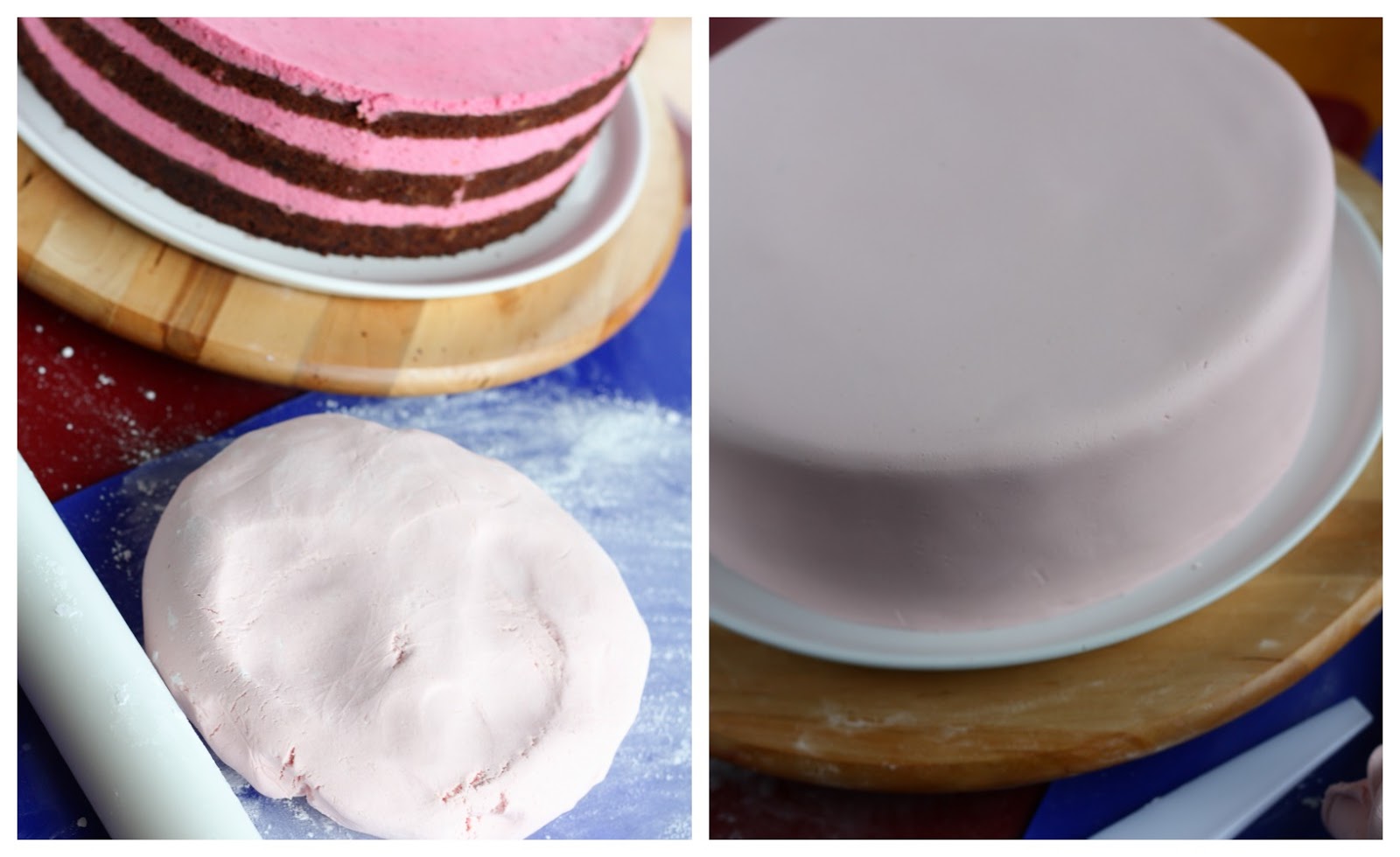 Tee valkosuklaamassa valmiiksi päivää ennen kuorruttamista. Värjää massa vaalean roosan väriseksi. Kaulitse ohuehkoksi levyksi. Nosta levy hyytyneen kakun päälle ja silitä sileäksi. Poista ylimääräiset reunat.