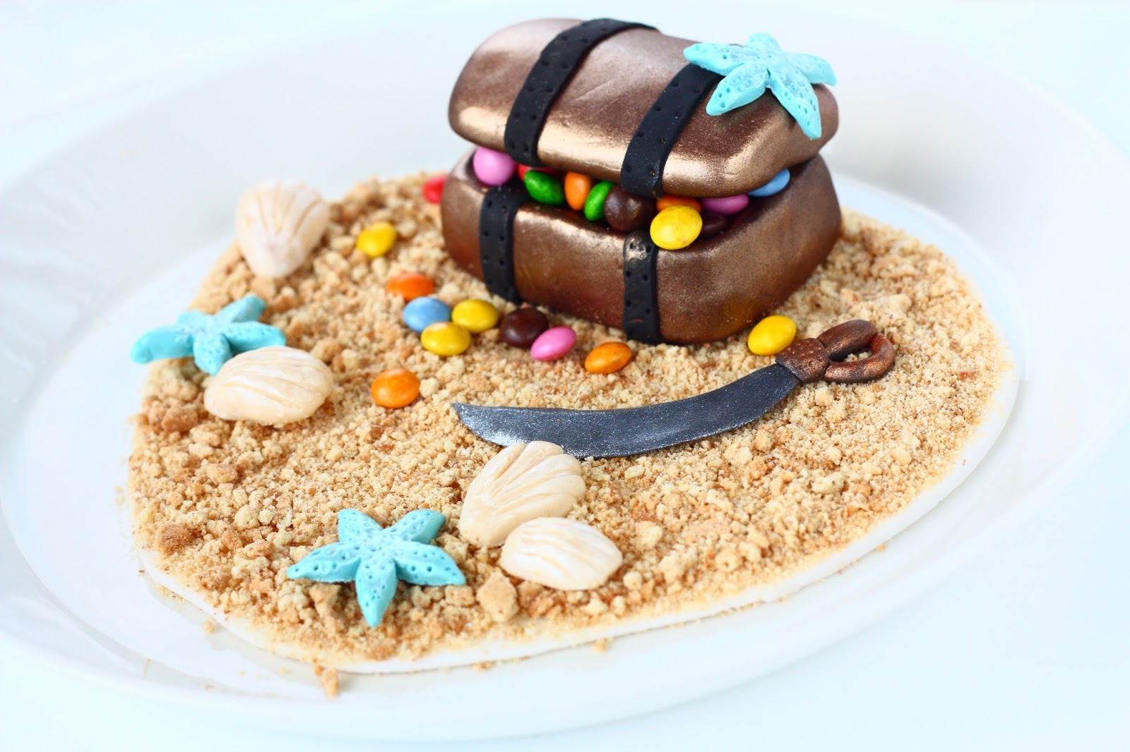 Aluslaatta ja miekka kaulintamassan ja sokerimassan sekoitusta, miekan pinnalla pronssista ja metallin väristä kimalletomuväriä