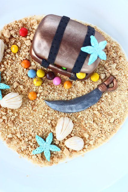 Kaverini pyysi tekemään poikansa synttärijuhliin merirosvoaiheisen kakun. Mokoma jääkaappimme meni kuitenkin harmillisesti rikki, eikä kakulle ollut säilytystilaa. Kaverini lupautui tekemään kakun itse, mutta sain tehdä sen päälle sentään koristeen. Tällainen siitä tuli 🙂