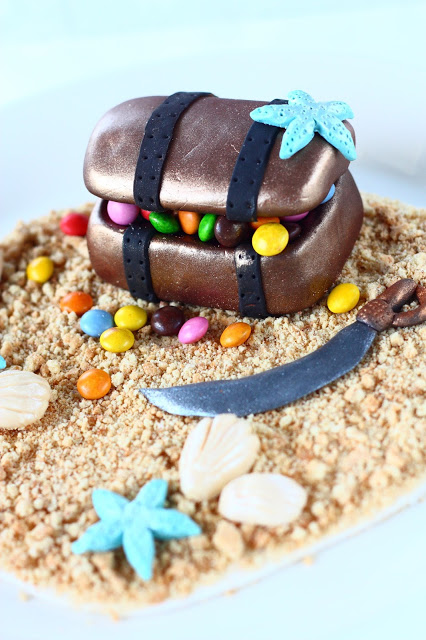 Aarrearkun ruskea osa kaulintamassan, sokerimassan ja itsetehdyn tumman suklaamassan sekoitusta , päällä pronssista kimallesprayta