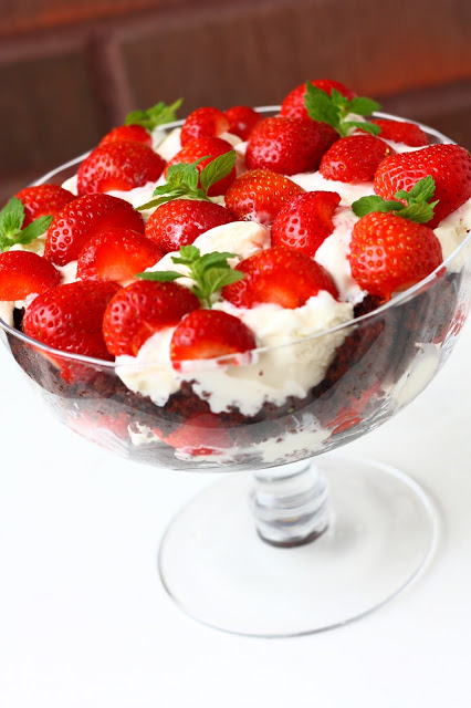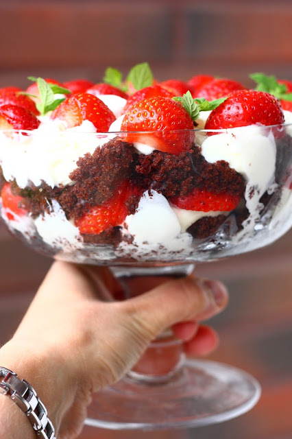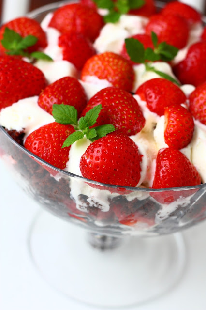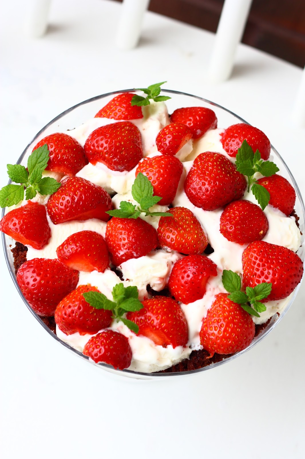 Mokkapalakakkuun tekemästäni mehevästä suklaakakkupohjasta jäi hieman yli. Pöydällä pyöri rasiallinen tuoreita mansikoita ja pakkasessa oli jäätelöä, joten jälkkäriajatus oli valmis. Yleensä syön (tai syötän) nuo ylimääräiset kakkupohjanpalat sellaisenaan, mutta tällä kertaa ne päätyivät tähän herkulliseen trifleen. Tekemisessä ei montaa hetkeä mennyt, ja syömisessä taisi mennä vieläkin vähemmän. Voih, kuinka yksinkertainen annos voikin olla näin hyvää! 🙂