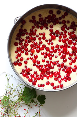 No mutta koska punaherukoita tuli paljon, pitihän niistä myös tehdä jotain. Kinuskisen punaherukkapiirakan ja Punoffee-piirakan jälkeen teki mieli yhdistää punaherukkaan jotain muuta kuin kinuskia. Kävin mielessäni läpi mansikan, valkosuklaan, jopa salmiakin. Lopulta voiton vei yksinkertainen vanilja. Huomasin nimittäin vanhassa Leivontaan-lehdessä vaniljaisen puolukkapiiran ohjeen. Koska herukat ovat puolukoiden tapaan happamia, ajattelin kokeilla niitä. Samalla ohje muokkaantui hieman (esim. voi vaihtui osaksi juoksevaan margariiniin, täytteeseen tuli vaniljasokerin sijasta sokeria ja vaniljajauhetta, ja täytteeseen tulevan voin ja maidon suhde muuttui maitovoittoisemmaksi). Niin ja laitoin punaherukoita suoraan raa’an taikinan päälle vähemmän kuin alkuperäisohjeessa oli, mutta lisäsin niitä vielä tuoreena kakun väliin..
