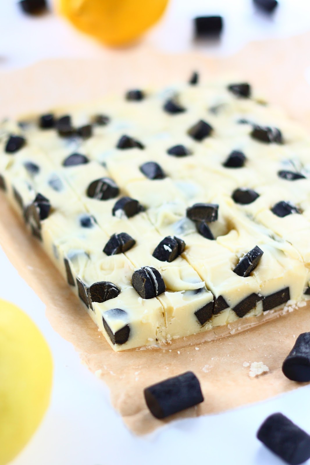 Helpot suklaafudget, joihin tulee helpoimmillaan vain kahta ainetta, ovat yksi eniten tekemistäni makeista herkuista. Tällä kertaa laitoin kondensoidun maidon ja valkosuklaan joukkoon makuaineiksi sitruunaa ja lakritsin paloja. Kyllä näistäkin vain hyviä tuli! Ihanan pehmoisia, miedon sitruunaisia makeisia. Nam!