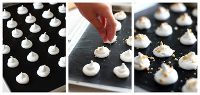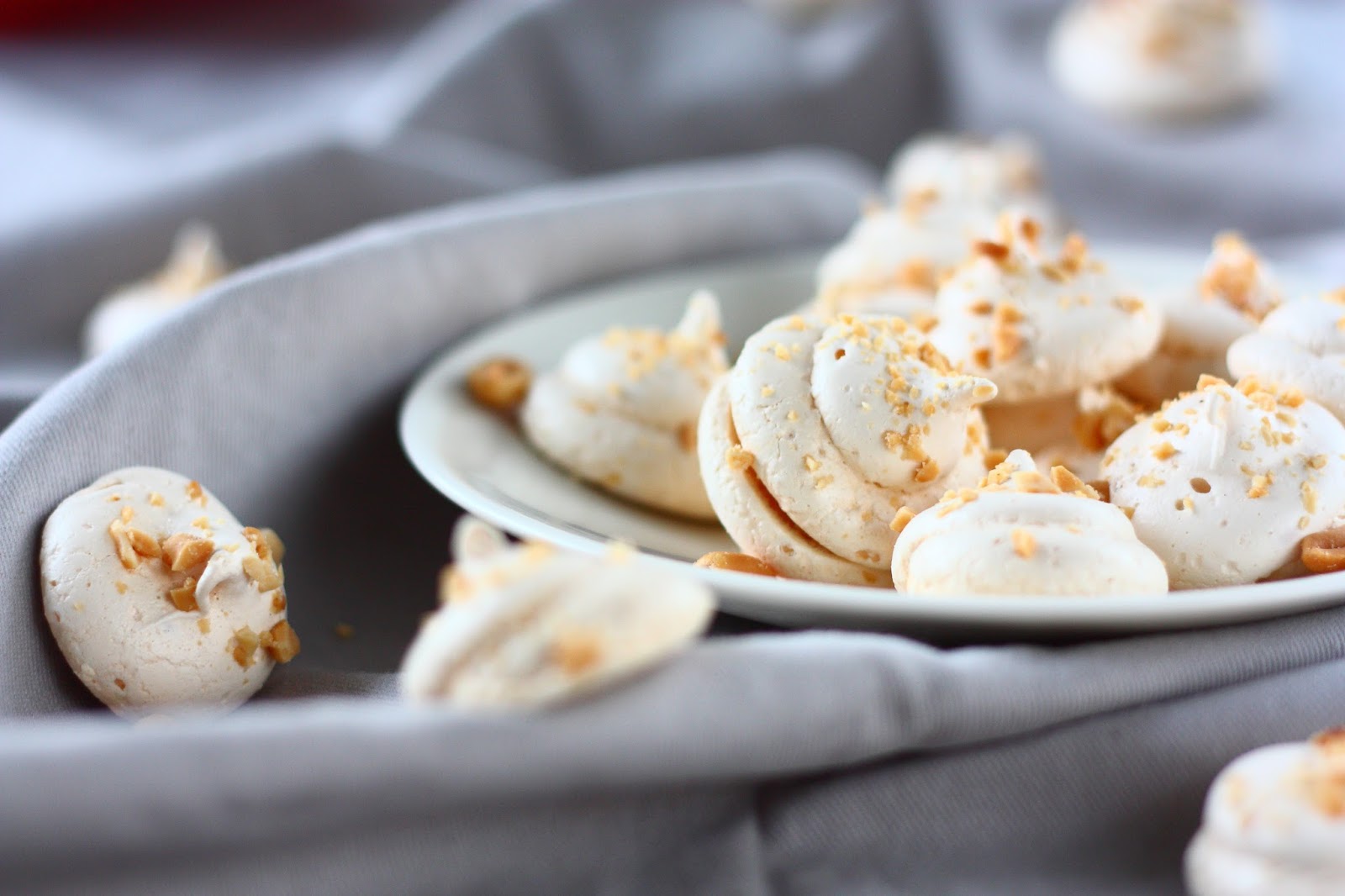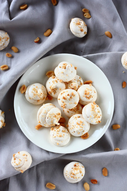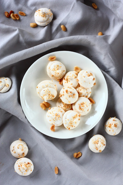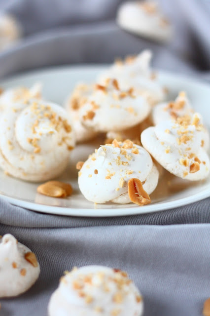 Esikoisen nimpparikahveelle leivottujen rapeiden suklaa-kaura-keksien tekemisestä jäi yli pari valkuaista. Koska uuni on valmiiksi lämmin muiden leivonnaisten tekemisestä, ajattelin samantein tehdä valkuaisista vielä marenkia. Kaipasin perusmarenkiin jotain pientä fiksausta ja hetken mietittyäni päähäni juolahti makean ja suolaisen yhdistämisen ihanuus. Tuo makupari toimii useissa leivonnaisissa, joten miksipä ei myös ylimakeissa marengeissa? Marenkien päälle ripotteli siis hieman rouhittuja suolapähkinöitä.