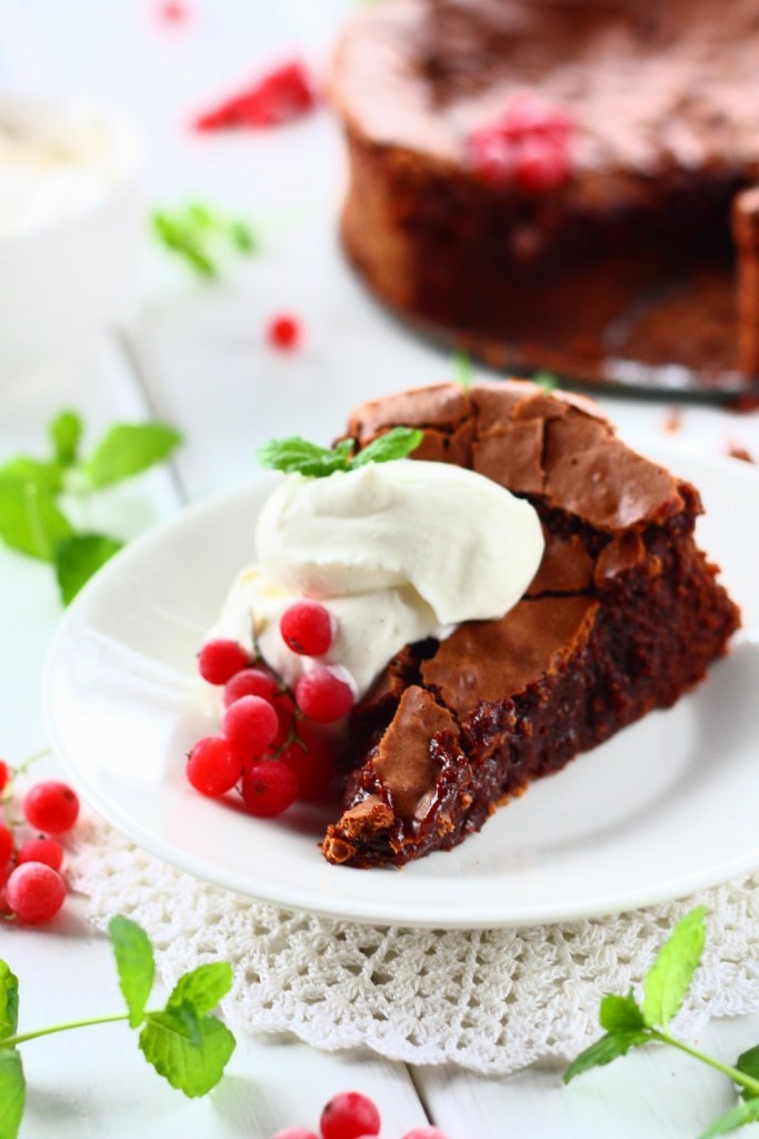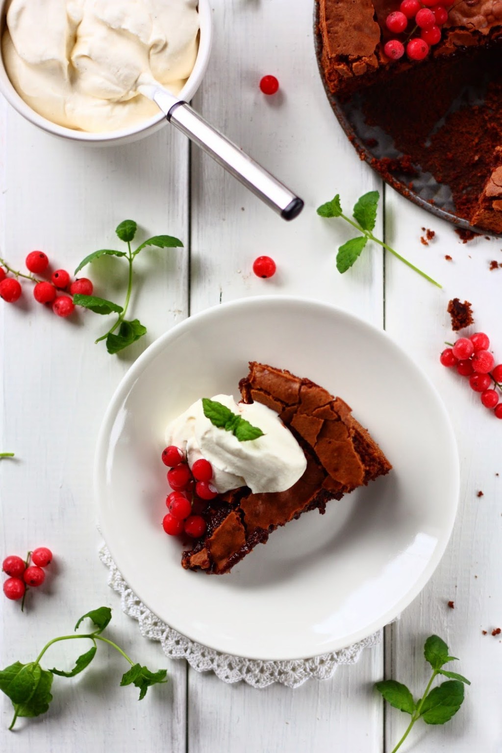 Mutaisen suklaapiirakka oli jopa omaan makuuni jopa miltei liian voimakkaan makuinen, mutta kun iskin kylkeen nokareen vaniljalla maustettua kermavaahtoa ja muutaman punaherukan taittamaan makeutta, niin voi nam!