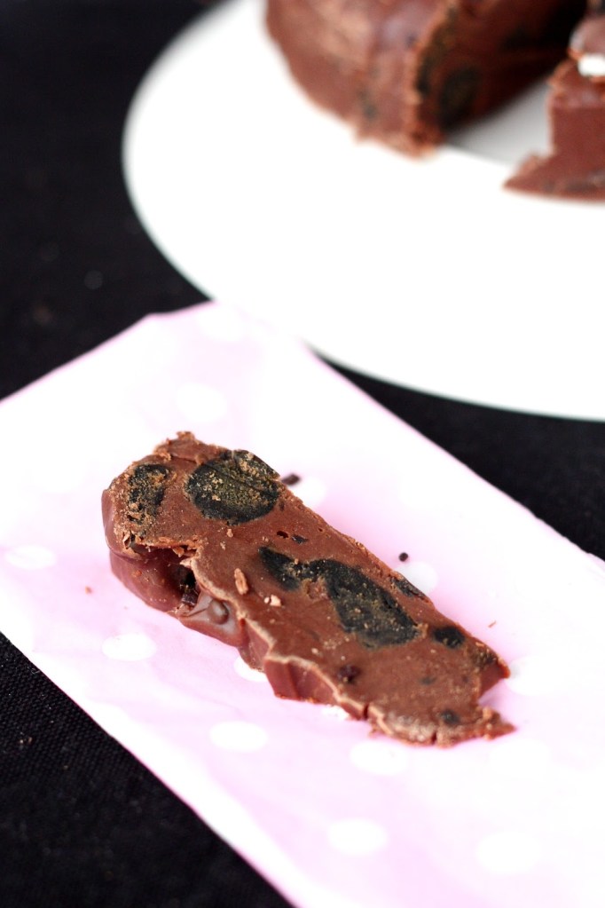 Tällainen suklaafudge on ehkä liiankin helppo, sillä tätä on tullut tehtyä (ja syötyä!!!) ehkä turhankin usein. Päämassa sisältää vain kolmea ainetta. Lämpömittariakaan ei tarvita, vaan aineet vain kuumennetaan kattilassa. Sen jälkeen joukkoon voi sekoittaa miltei mitä tahansa. Siis todella helppoa ja nopeaa. Yleensä leikkaan massaan kuutioiksi, mutta eipä ollut huonompi idea tämä kakkukaan. Tulipahan hieman erilaista tällä kertaa.