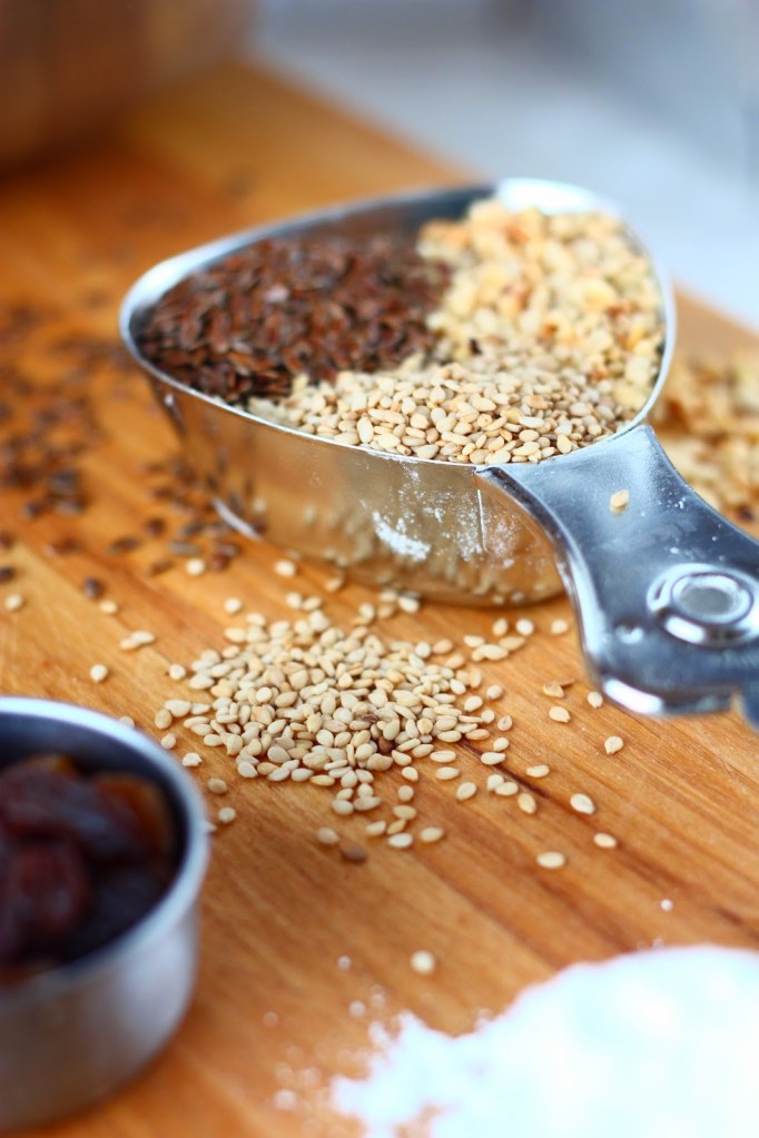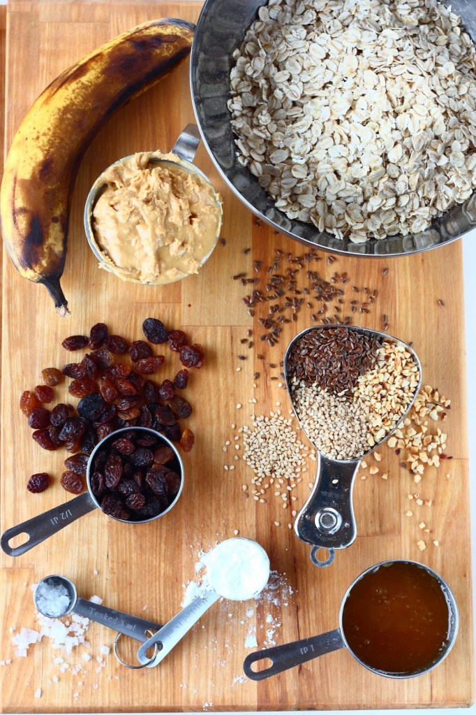 Perusmassaan kuuluu vain 5 ainetta. Näiden lisäksi joukkoon voi helposti hukuttaa kaikkea kaapeissa pyörivää ylimääräistä. Itse heittelin sekaan seesaminsiemeniä, pellavansiemeniä ja avatun pussin hasselpähkinärouhetta sekä rusinoita. Hedelmäisyyttä ja hiilihydraattipitoisempia patukoista saa lisäämällä joukkoon erilaisia kuivattuja hedelmiä.