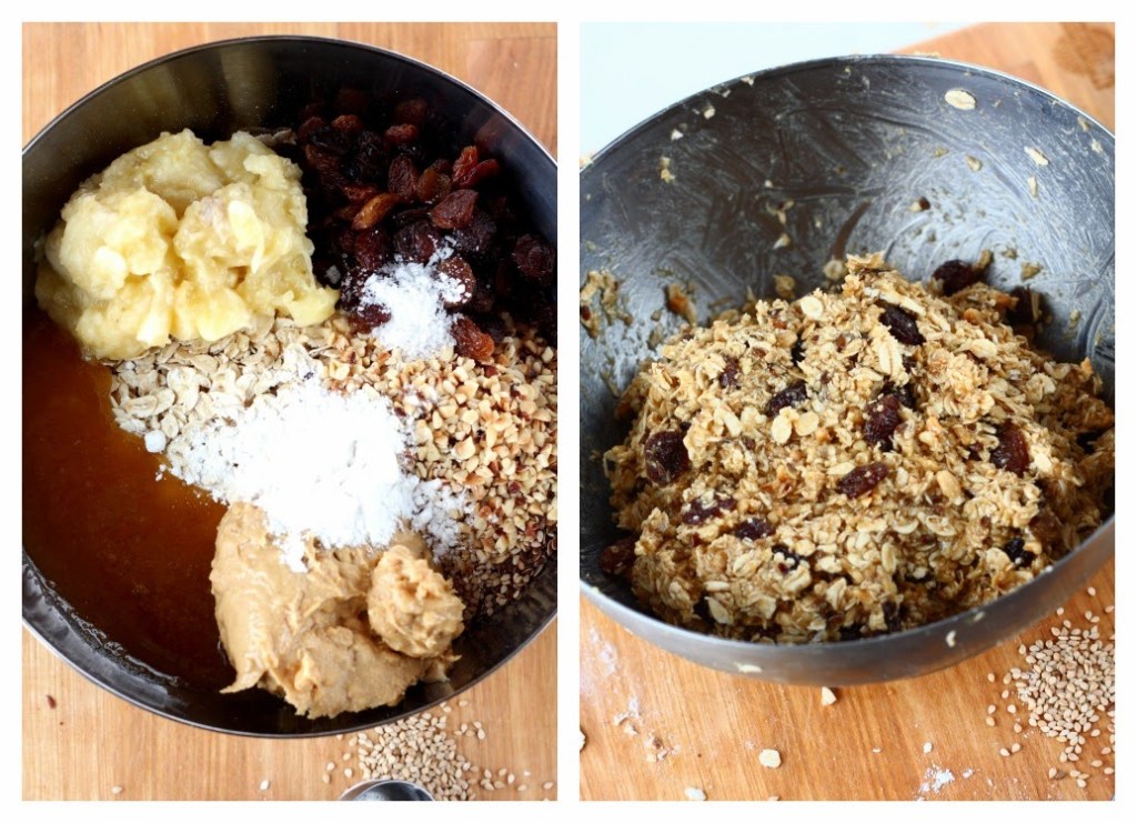 Lisää kaurahiutaleiden joukkoon soseutettu banaani, maapähkinävoi, suola ja hunaja. Lisää myös haluamiasi kuivahedelmiä, pähkinöitä yms.. Sekoita käsin, kunnes ne ovat kunnolla sekoittuneet keskenään. Valmiin massan pitäisi olla sen verran kosteaa, että se pysyy juuri ja juuri kasassa, mutta ei niin tahmeaa, että se tarttuu käsiin. Jos massa on kovin tahmeaa, lisää joukkoon kaurahiutaleita ja sekoita jälleen hyvin.