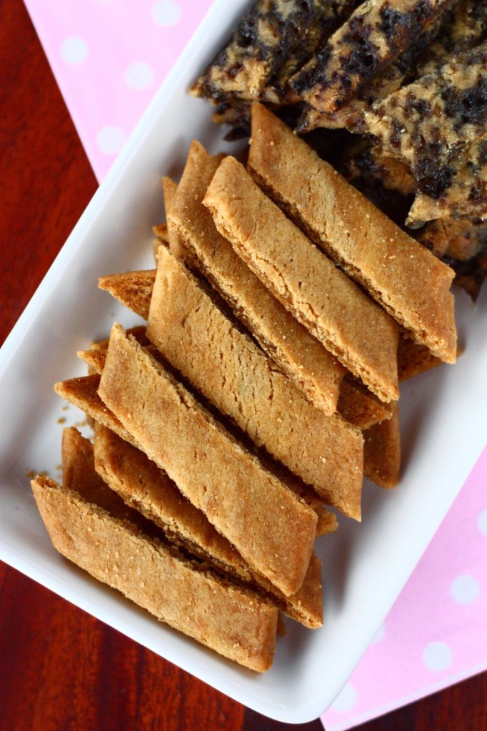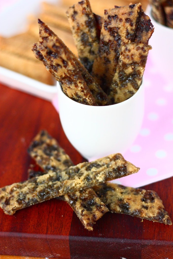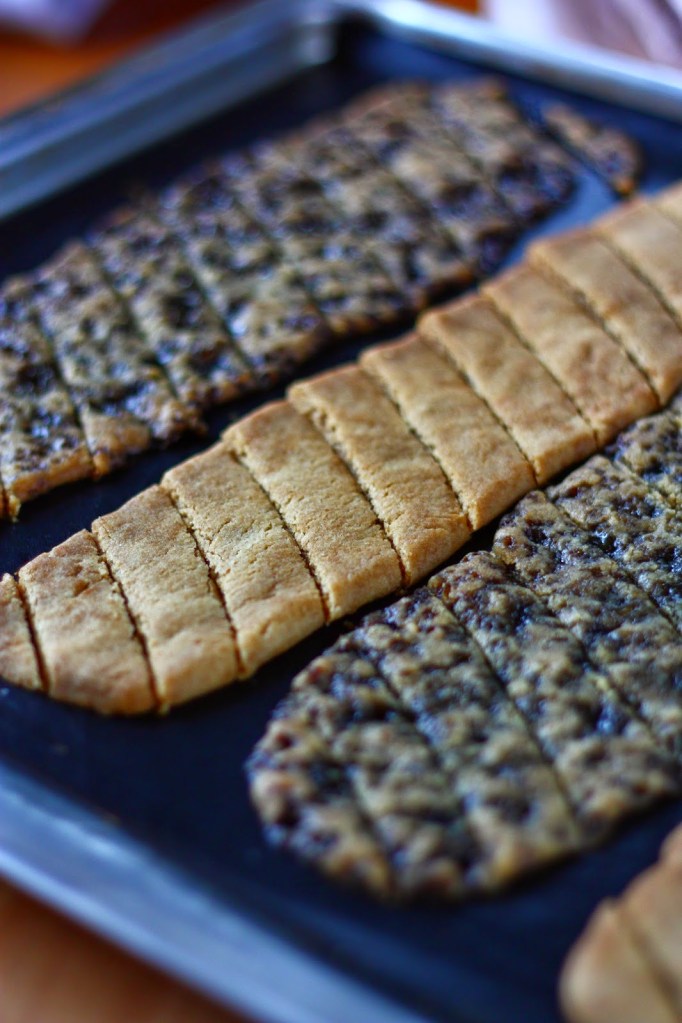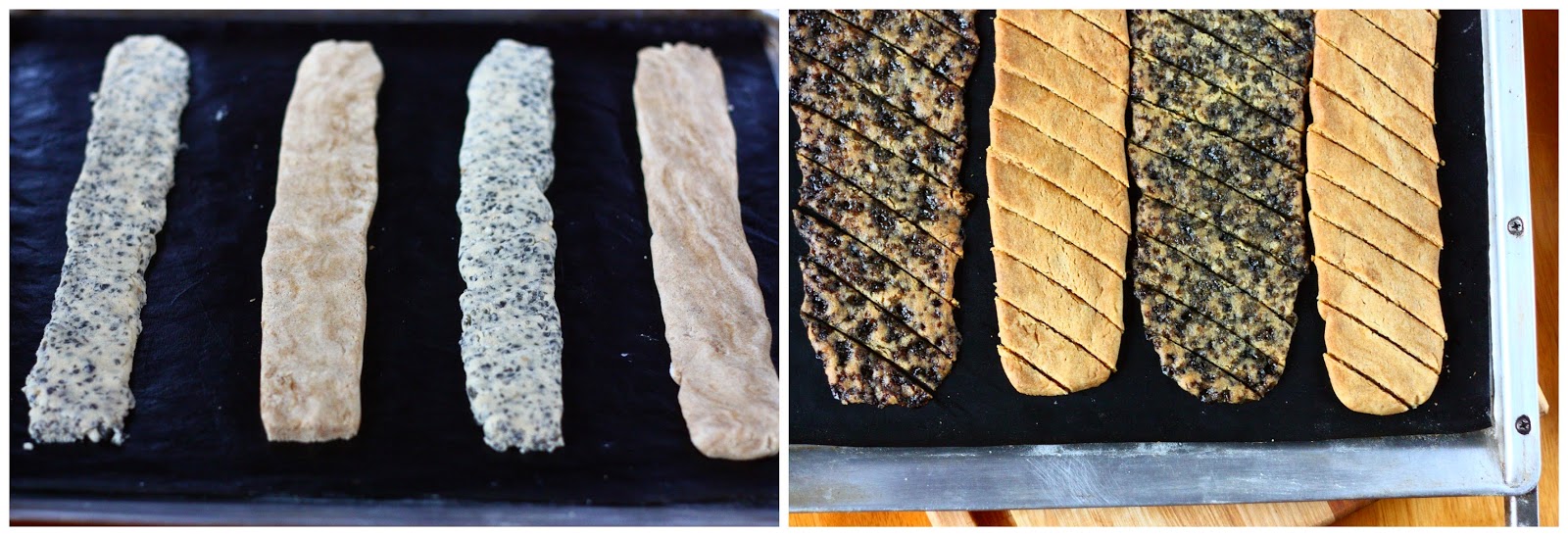 Paista 175 asteessa n. 12 minuuttia, kunnes keksit ovat laskeutuneet. (Siinä vaiheessa kun otin keksit pois uunista, turkinpippurikeksit kuplivat kauttaaltaan pienillä kuplilla ja saivat ehkä aavistuksen väriä reunoihin. Lakritsijauhetta sisältävät keksit laskeutuivat ja alkoivat tuntua sormin koitettuna reunoilta kiinteältä.) Leikkaa heti pian, vielä kuumina vinottain. Sain yhdestä pötköstä n. 12 valmista keksiä.