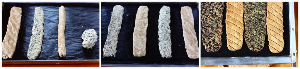 Vaahdota voi ja sokeria vaaleaksi vaahdoksi. Vatkaa joukkoon siirappi. Sekoita kuivat aineet keskenään. Jaa taikina kahteen yhtä suureen osaan. Lisää toiseen osaan turkinpippurirouhe ja toiseen lakritsijauhe. Sekoita vain sen verran, että aineet ovat juuri ja juuri sekoittuneet.Jaa taikinat vielä kahteen osaan. Pyörittele kukin osa (4 kpl) n. 30 cm pituisiksi tangoiksi ja laita pellille leivinpaperin päälle (vasemman puoleinen kuva alla). Litistä tankoja hieman (keskimmäinen kuva). Jätä tankojen väliin kunnon raot, sillä pötköt leviävät kypsyessään melkoisesti (oikean puoleinen kuva alhaalla). Turkinpippurikeksit leviävät enemmän kuin lakuversiot.