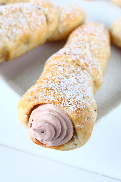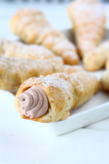 Tee täyte vatkaamalla kerma vaahdoksi. Vatkaa joukkoon nutella/suklaa-pähkinälevite. Pursota täyte tuuttien sisään. Nauti! 🙂