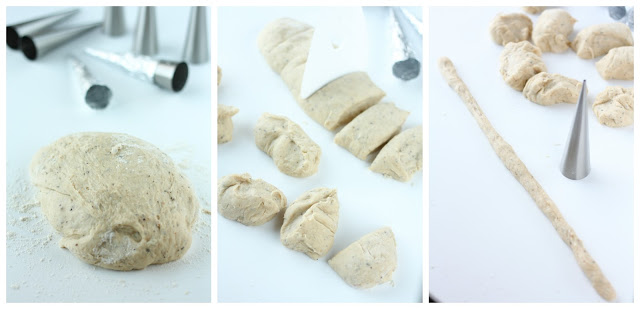Pyörittele kohonneesta pullataikinasta pötkö ja jaa se 12 osaan. Rullaa jokaisesta taikinapalasta n. 55 cm pitkä pötkö.