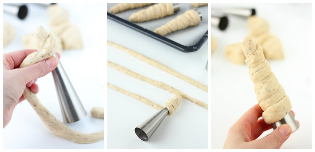 Kiedo taikinapötkö tötterön ympärille. Aloita kapeasta päästä niin, että pohjaan ei jää reikää.
