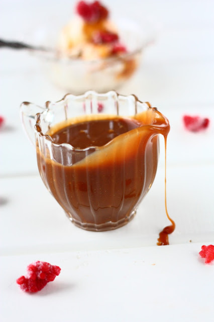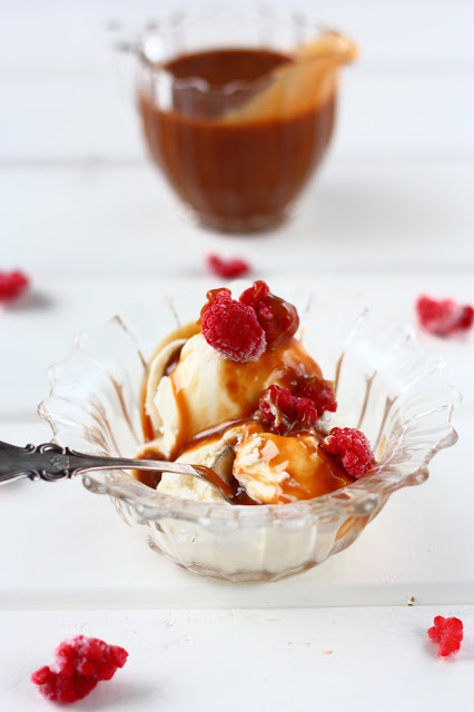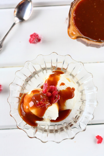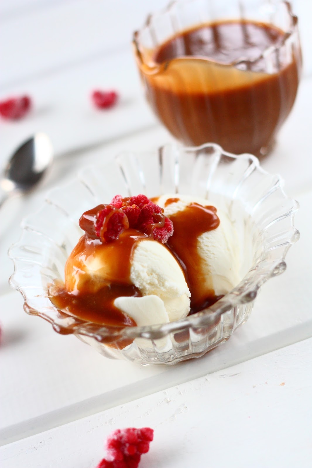 Olen jo usein bloginkin puolella maininnut, etten juo kahvia sillä en pidä sen mausta, mutta leivonnassa se on ihan huippujuttu! Yhdistettynä taikinaan tai kinuskiin, sen maussa vain on sitä jotain. Nyt olin kärsinyt ”mokan himosta” jo niin kauan, että päätin tehdä asialle jotain. Pakkasessa oli vaniljajäätelöä, ja mikäs sen parempi kaveri jätskille kuin kinuskikastike, ja se höystettynä kahvilla. Voi nam! Kylläpäs oli niin mahdottoman hyvää!