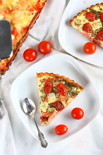 Teen suolaisia piirakoita todella harvoin, ja nyt kun taas innoistuin tekemään sellaisen, tein samalla kaksi suunnilleen samanlaista piirakkaa. Molemmissa oli lohta ja reilusti juustoa. Toiseen laitoin lisäksi minitomaatin puolikkaita, ja toiseen päätyi vielä hieman extrajuustoa.
