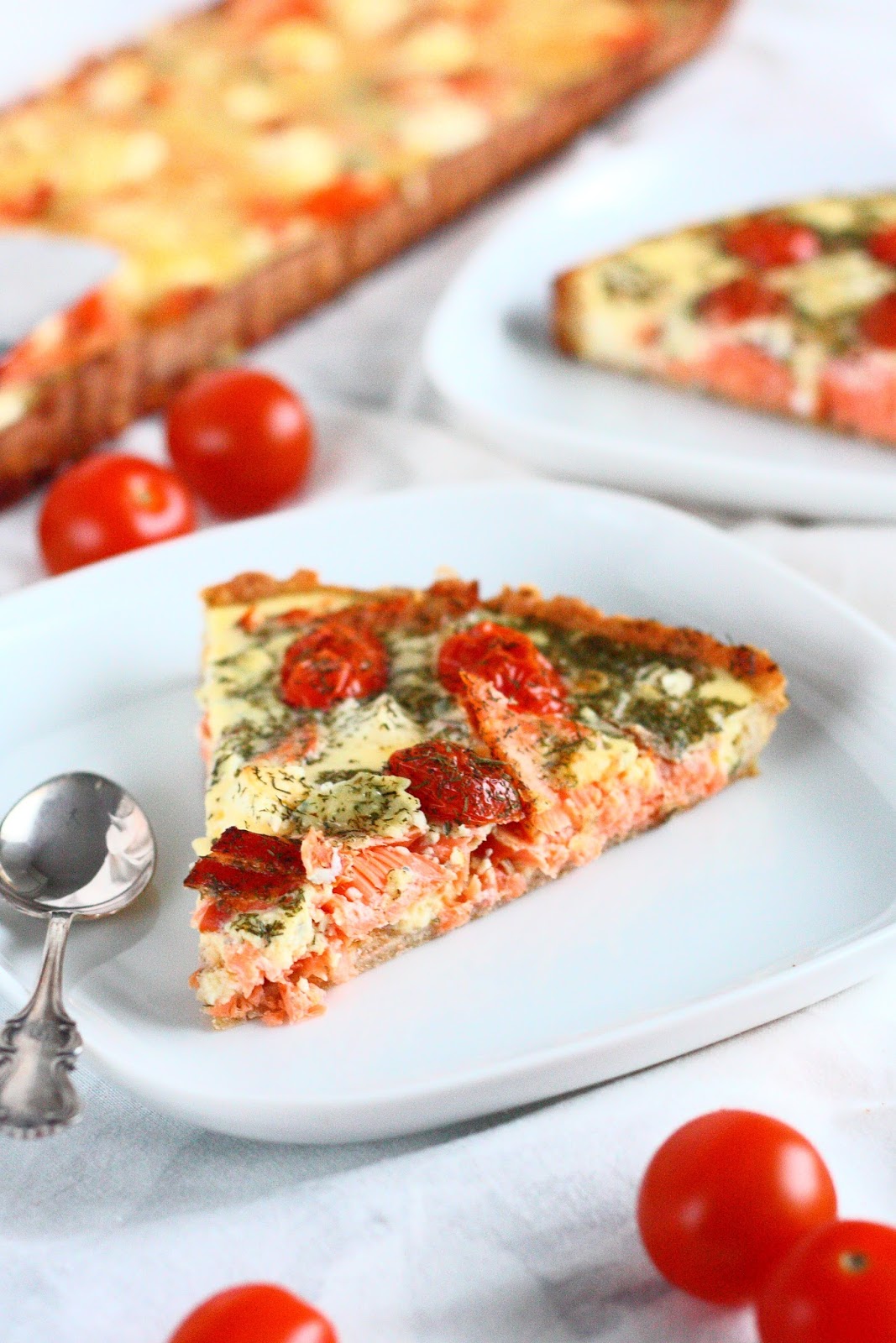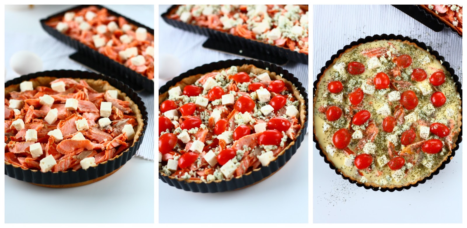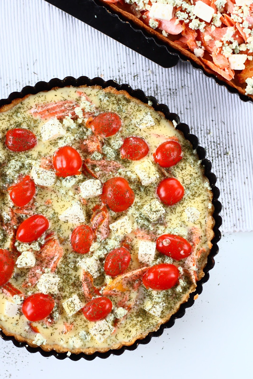Teen suolaisia piirakoita todella harvoin, ja nyt kun taas innoistuin tekemään sellaisen, tein samalla kaksi suunnilleen samanlaista piirakkaa. Molemmissa oli lohta ja reilusti juustoa. Toiseen laitoin lisäksi minitomaatin puolikkaita, ja toiseen päätyi vielä hieman extrajuustoa.