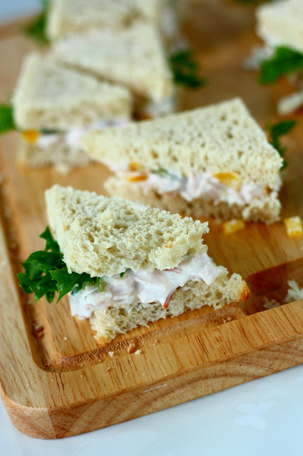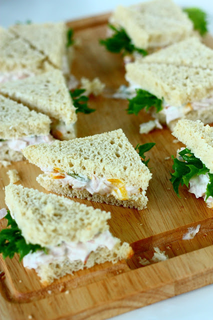 Esikoisen synttäreillä oli toiveesta suolaisena tarjottavana kolmioleipiä. Pelkäsin aluksi hieman leipien puolesta, sillä aiemmat yritykseni ovat olleet liian kuivia ja mauttomia. Nyt lisäsin täytteisiin tarpeeksi kosteutta ja makuja, ja hyviähän näistä nyt tuli. Itse tykkäsin tosi paljon reippaamman makuisesta tonnikalaversioista, mutta lapsille maistui paremmin miedon makuiset kalkkuna-tzatziki-täytteiset leivät. Kalkkuna päätyi leipien täytteeksi kinkun sijasta yhden syöjän ruokarajoituksen takia.