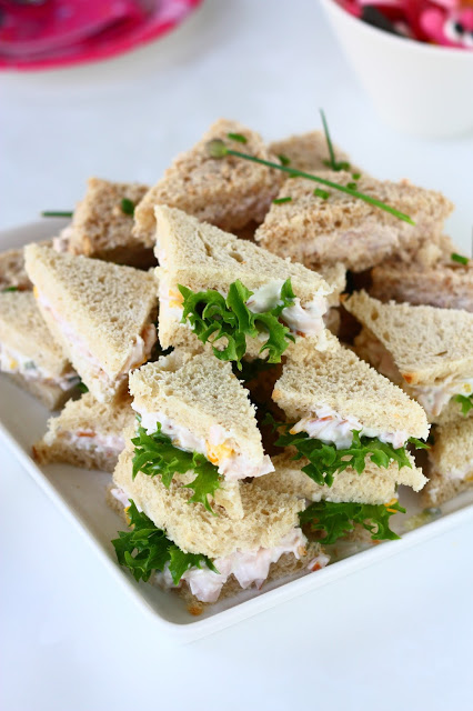 Leipien täyttäminen oli vähän haastavaa kosteiden täytteiden takia. Kokeilinkin leikata paahtoleivistä ensin reunat pois ja täytin vasta sitten. Toisena keinona koitin täyttää leivät ensin ja leikellä niistä vasta sitten reunat pois. Noh, yhtä suttaavaa touhua molemmat. Ehkä siististi leikkaamiseenkin on olemassa jokin jippo kolmonen, mutta se jäi tällä kertaa kokematta. Tässä vielä ohjeet molempiin täytteisiin sellaisena kuin tein ne.