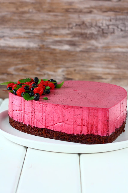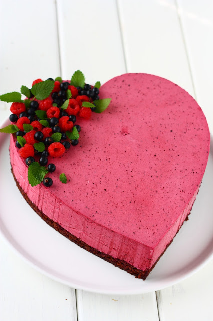 Mustaherukkamoussekakku mehevällä suklaapohjalla Sydänvuokaan, vastaa n. 26-27 cm pyöreää vuokaa.