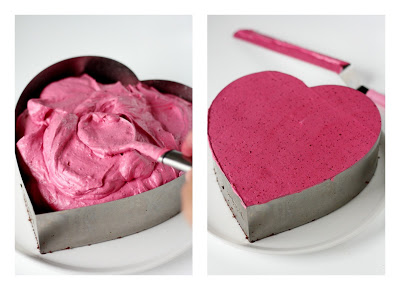 Leikkaa esim. sydämen mallisen reunavuoan avulla pohjasta palanen. Laita vuoan reunat tarjoilulautaselle ja pohjapala reunojen sisään. HUOM! Pohjan liikuttelu onnistuu helpoiten, jos pohja on käynyt pakkasen kautta ja on jäässä! Voitele vuoan reunat kevyesti. Voitelu auttaa kakkua irtoamaan helpommin. Kakku suorastaan liukuu pois, jos reunat on rasvattu. Kaada täyte pohjan päälle ja heiluttele hieman, niin täyte menee tasaisemmin. Tasoita vielä päältä vaikkapa palettiveitsellä.