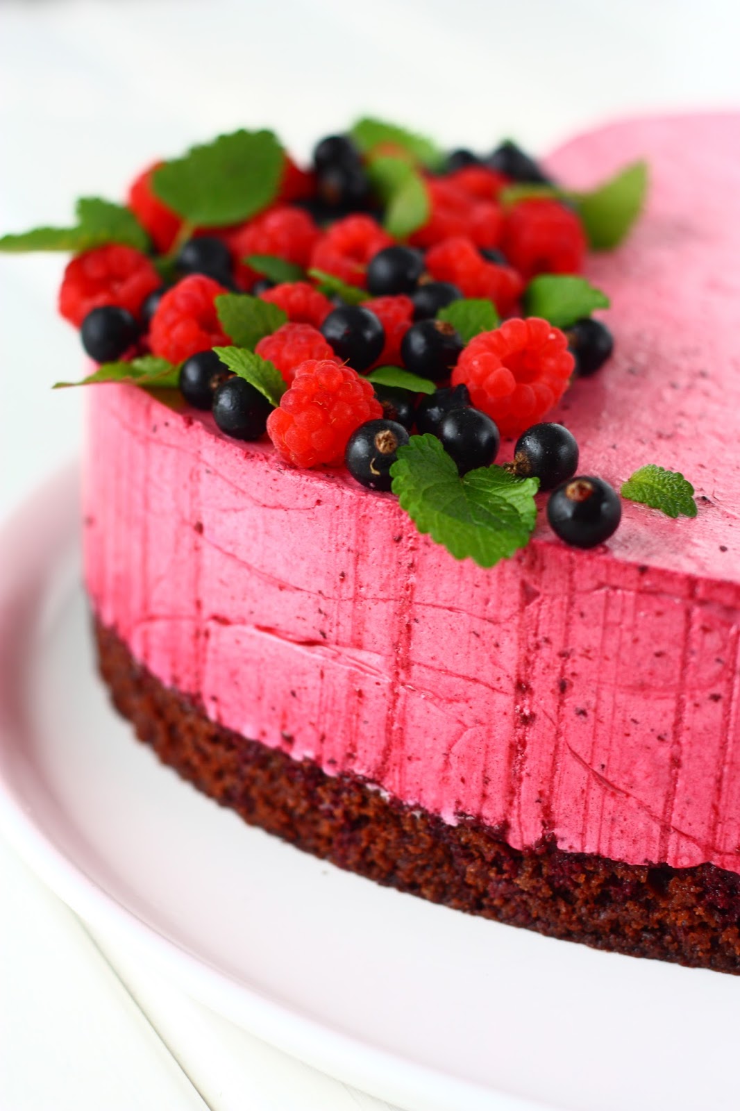 Laita jääkaappiin jähmettymään muutamaksi tunniksi (tai pakasta kakku, kuten itse tein). Kun kakku on hyytynyt, poista vuoan reunat. Koristele vaikka kermavaahdolla ja marjoilla.