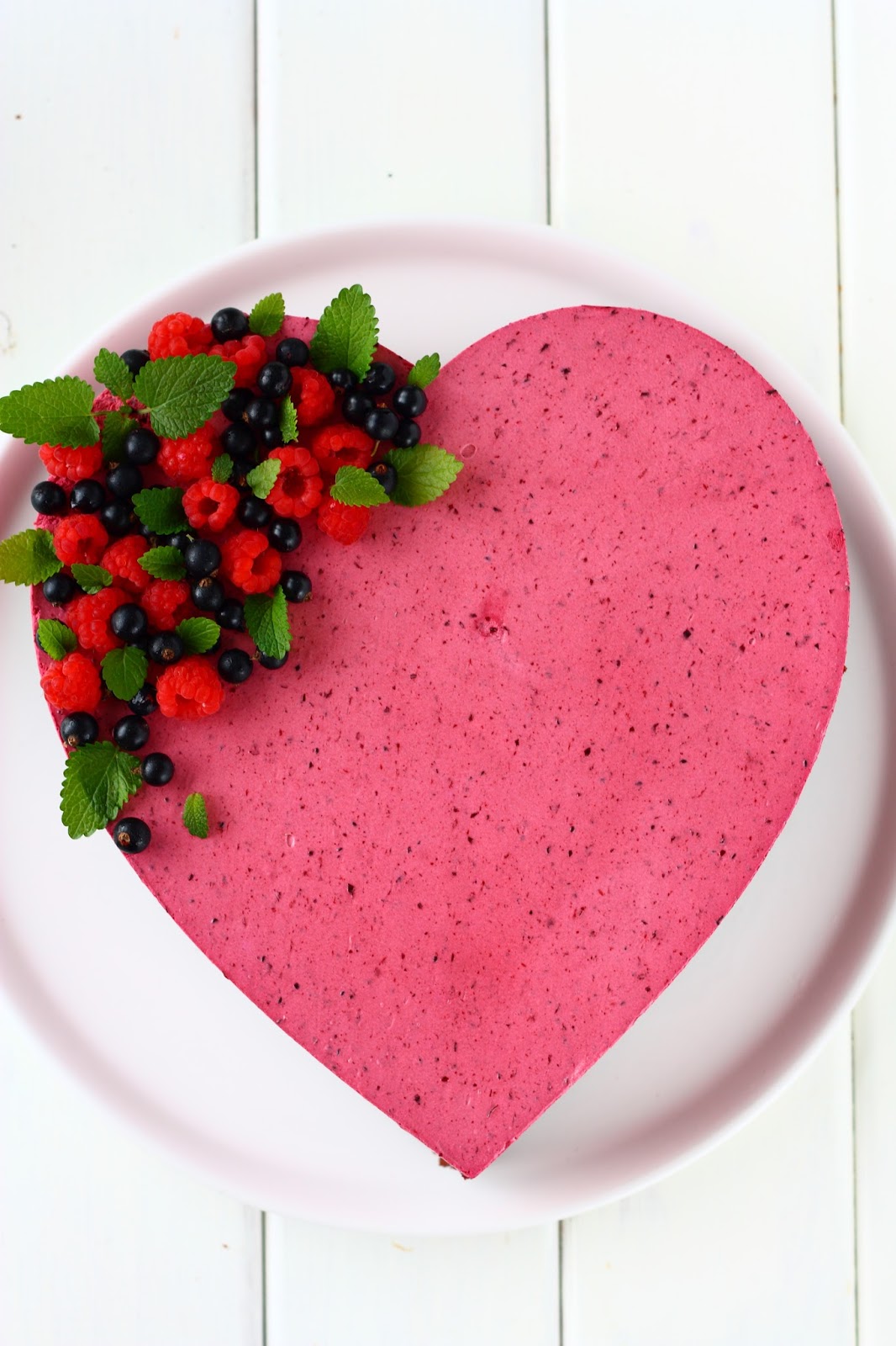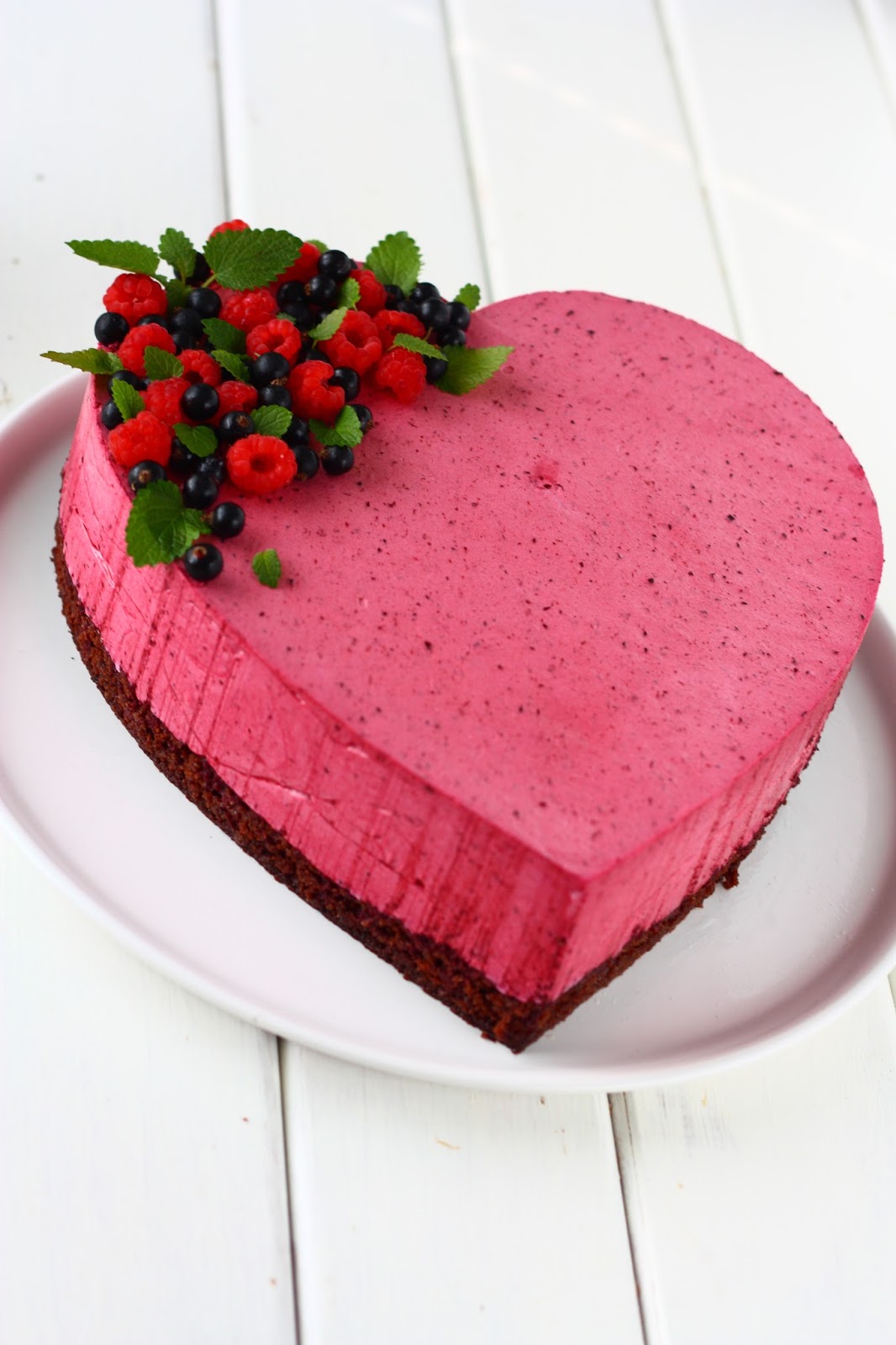 Mustaherukkamoussekakku mehevällä suklaapohjalla Sydänvuokaan, vastaa n. 26-27 cm pyöreää vuokaa.