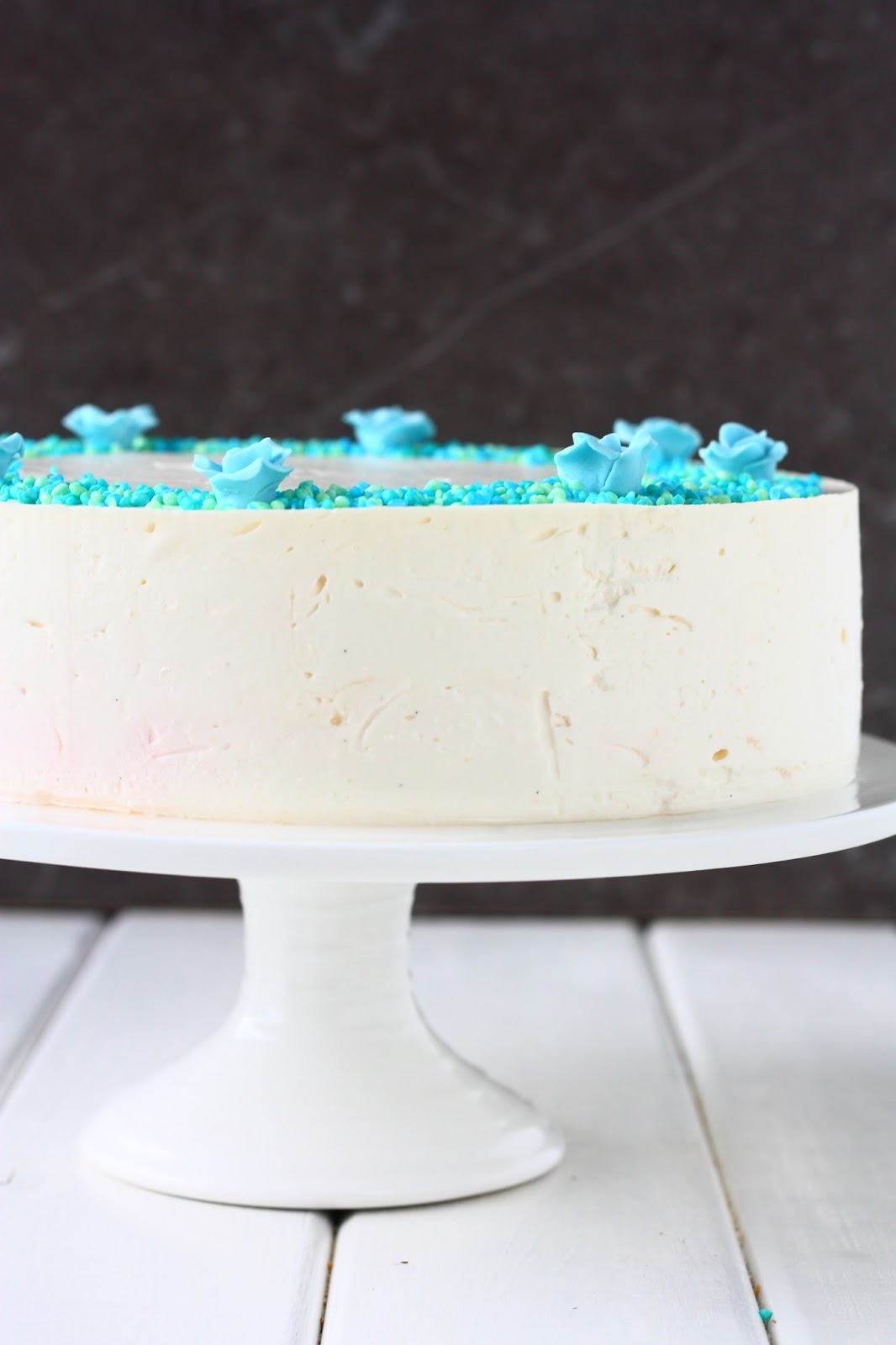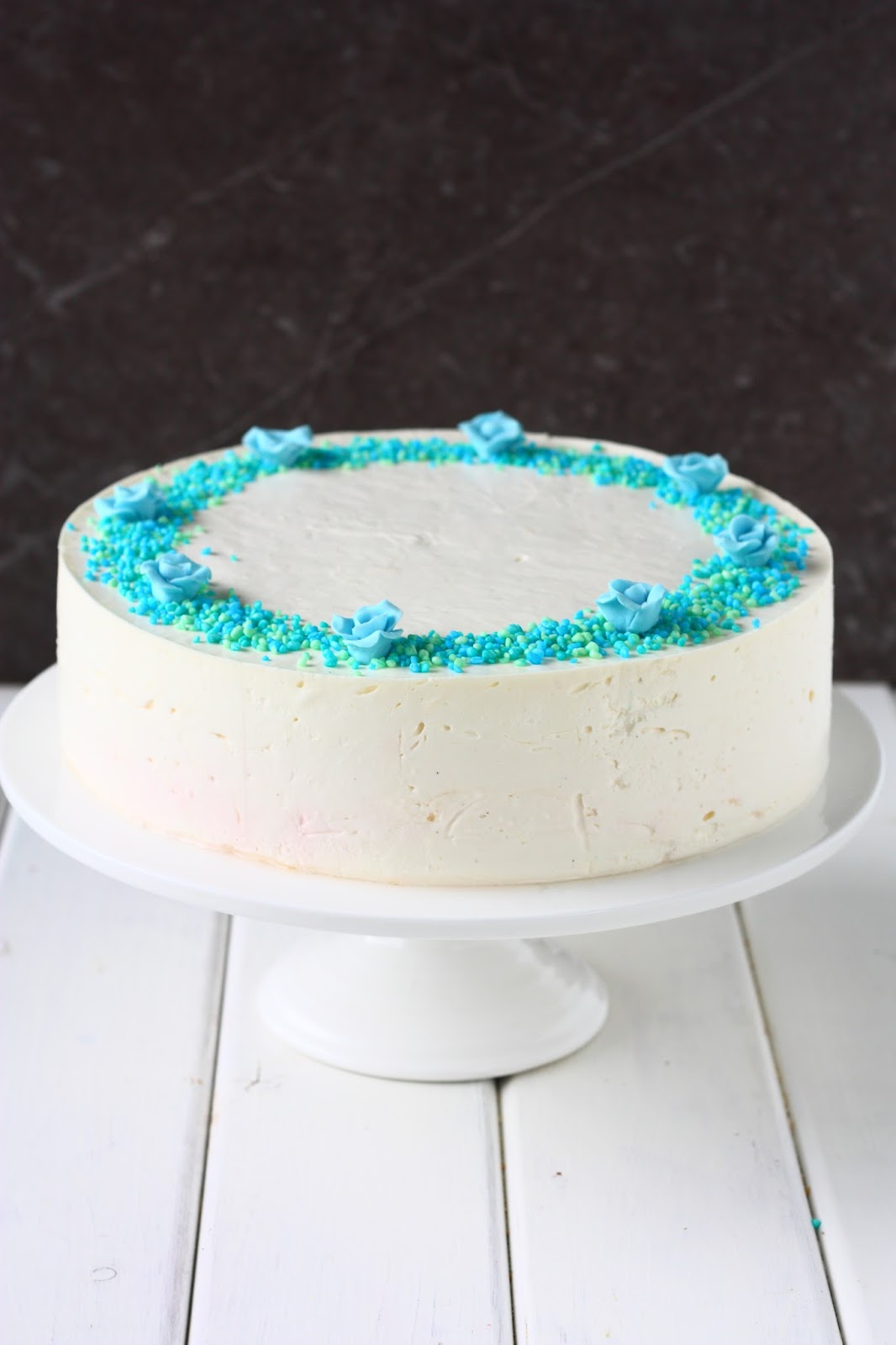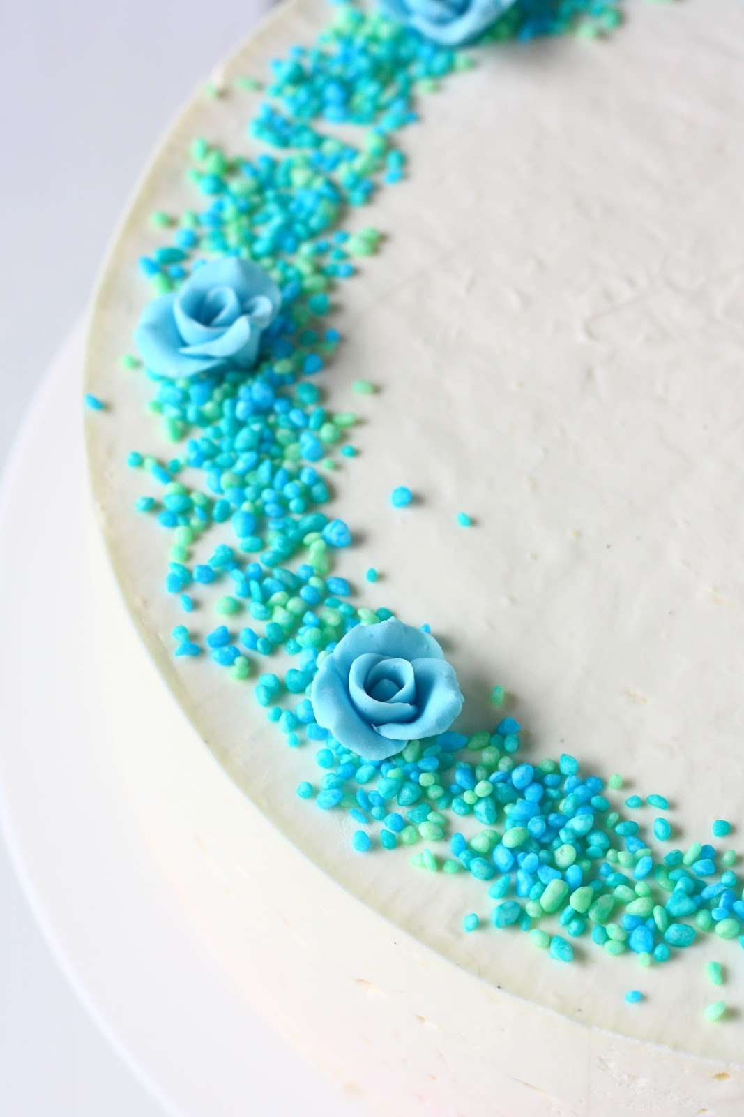 Kokosin kakun irtopohjavuokaan. Pakastin kakun ja nostin sen jäisenä tarjoilulautaselle. Kakkua ei kuitenkaan missään nimessä kannata pakastaa! Meinasi nimittäin tulla suuri pieni paniikki, kun ristiäisiä edeltävänä päivänä katsoin pakkasesta otettua, sulanutta kakkua. Kakun pinta oli mennyt kummallisen hileisen näköiseksi, ja se muistuttui kurttuista ihoa. Lisäksi kakku valutti lautasella mielettömät määrät jotain sokerilientä! Voi kääk! Kyseisen kakun piti päätyä pöytään pääkakuksi, mutta enhän minä sellaista kurttukasaa siihen voinut laittaa! Onneksi vika oli vain päällä, ja päätin koristella kakun aivan eri tavalla varastosta löytyvillä kukkasilla ja strösseleillä. Ja tehdä äkkiä uuden kakun! Onneksi aikaa oli vielä jäljellä ja sain väsättyä pöytään uuden ”pääkakun”. Siitä kakusta lisää sitten toisessa postauksessa 🙂