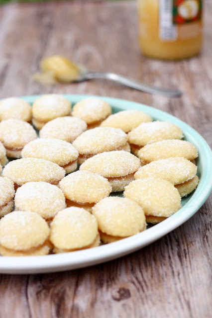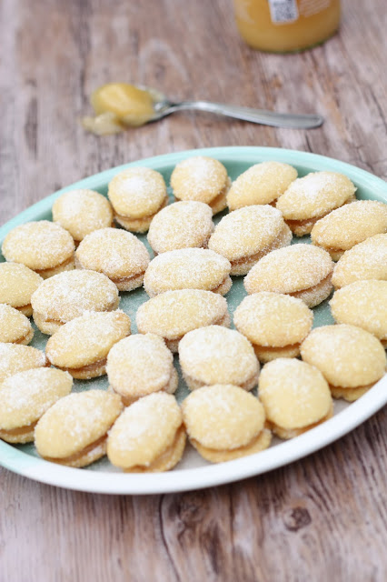 Tein taikinan muuten samalla tavalla kuin viimeksikin, mutta vähensin hieman sokerin määrää taikinassa, sillä aioin joka tapauksessa sokeroida valmiit lusikkaleivät. Laitoin myös hieman enemmän vehnäjauhoja. Väliin laitoin hetken mielijohteesta Lemon Curd-tahnaa. Lopputulos oli kielenvievä!