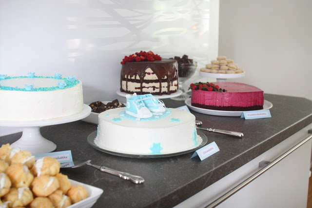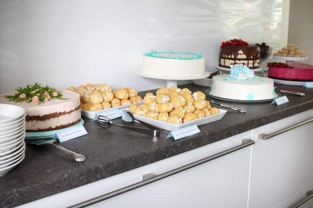 Tässä vielä yhteenveto poikamme ristiäisten tarjottavista 🙂 Juhlissa oli paikalla 14 aikuista ja 9+1 lasta, ja pöydästä löytyi sekä suolaista että makeaa koko poppoolle. Alunperin ajatukseni oli tehdä vain muutama leivonnainen, mutta kuten yleensä, leipominen hieman pääsi käsistä ja pöydästä löytyi pari kakkua suunniteltua enemmän 😉 Tällä kertaa tosin syynä suurempaan määrää tarjottavia oli leipomisinnostuksen sijasta jatkuvat epäonnistumiset ja ulkonäöllisesti täydellisen (ja kuitenkin pakastettavan) kakun metsästys. Mutta eipä siinä mitään, nyt päästiin maistelemaan paljon erilaisia juttuja, nams!