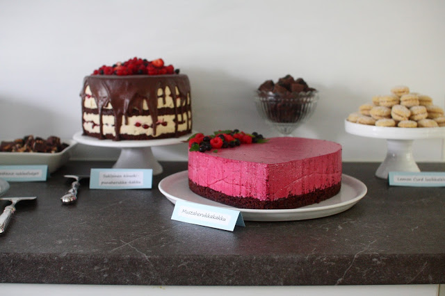 Sydämen mallinen mustaherukkakakku oli mielettömän hyvää! Sen täyte maistui ihanasti mustaherukalle ja oli mielettömän suussasulavan pehmeä ja ilmava. Myös sen takana olevat mokka-lakritsifudget maistuivat todella ihanille. Ja pakko kehua myös kuvassa oikeassa reunassa näkyviä Lemon Curd lusikkaleipiä, niiden popsimisesta nautin paljon.