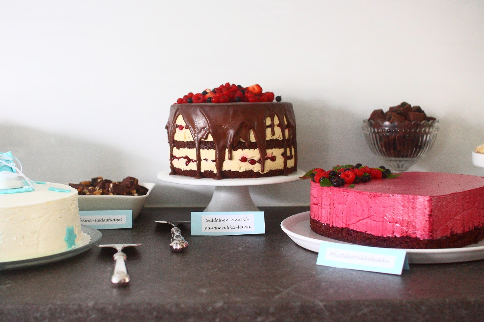Sydämen mallinen mustaherukkakakku oli mielettömän hyvää! Sen täyte maistui ihanasti mustaherukalle ja oli mielettömän suussasulavan pehmeä ja ilmava. Myös sen takana olevat mokka-lakritsifudget maistuivat todella ihanille. Ja pakko kehua myös kuvassa oikeassa reunassa näkyviä Lemon Curd lusikkaleipiä, niiden popsimisesta nautin paljon.