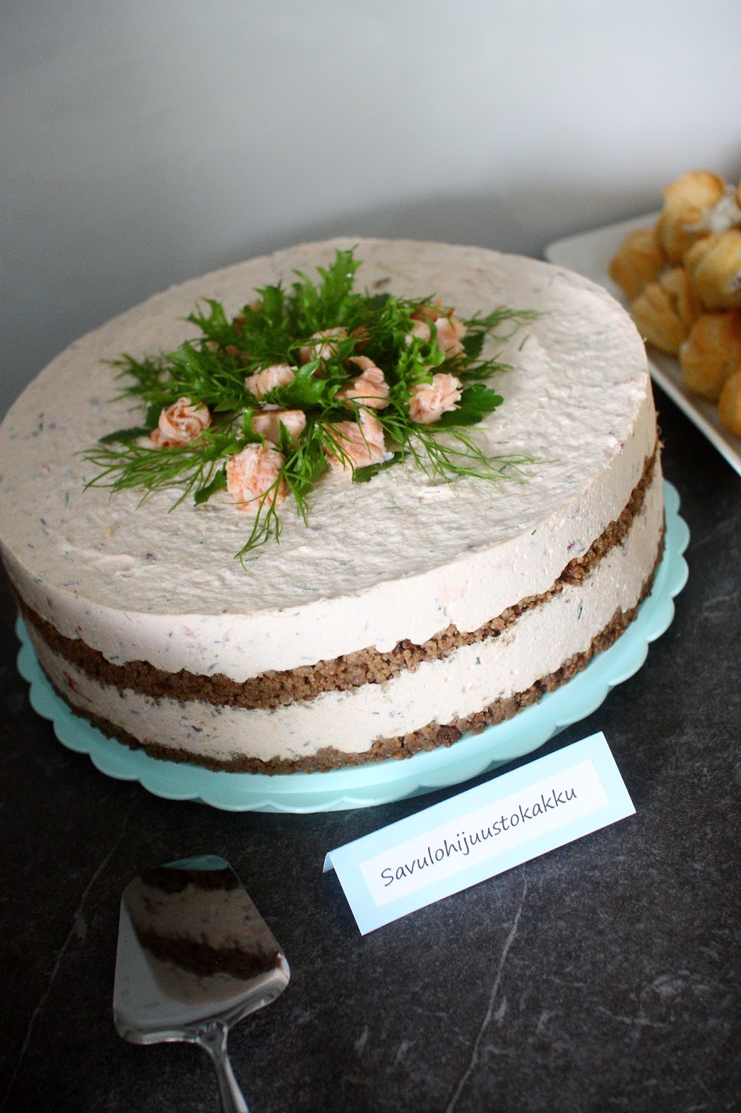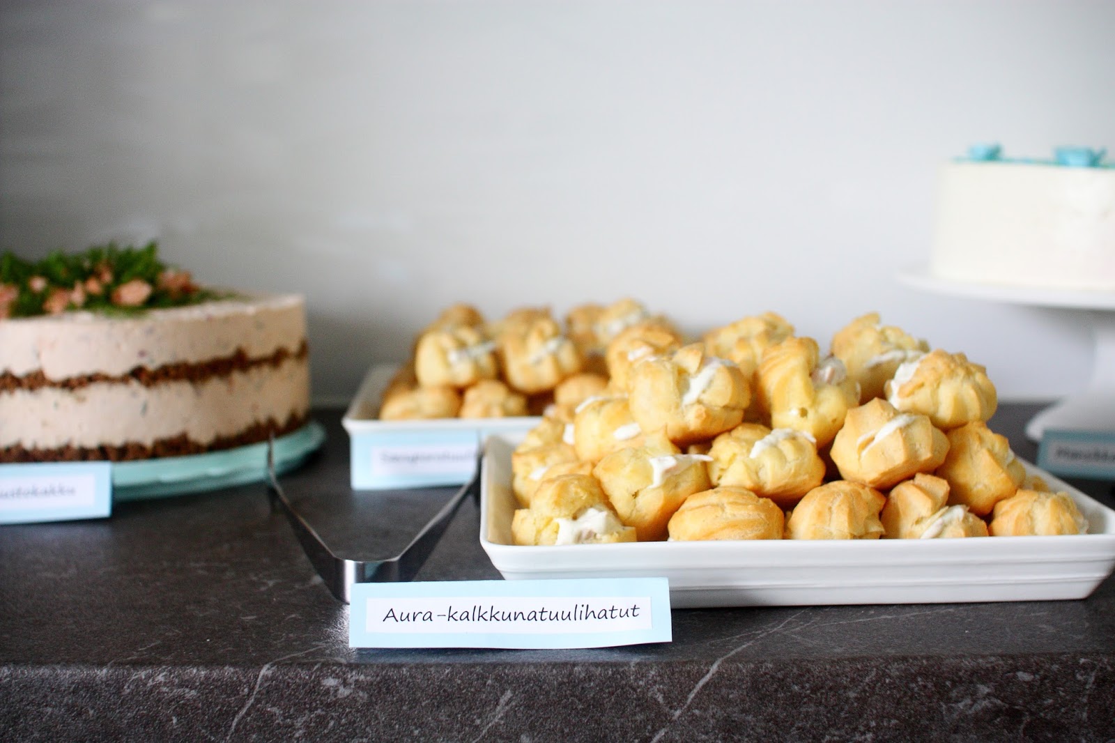 Suolaisia tarjottavia oli herkullinen ja voimakkaan makuinen savulohijuustokakku sekä tuulihatut savuporo- ja aura-kalkkuna -täytteillä.